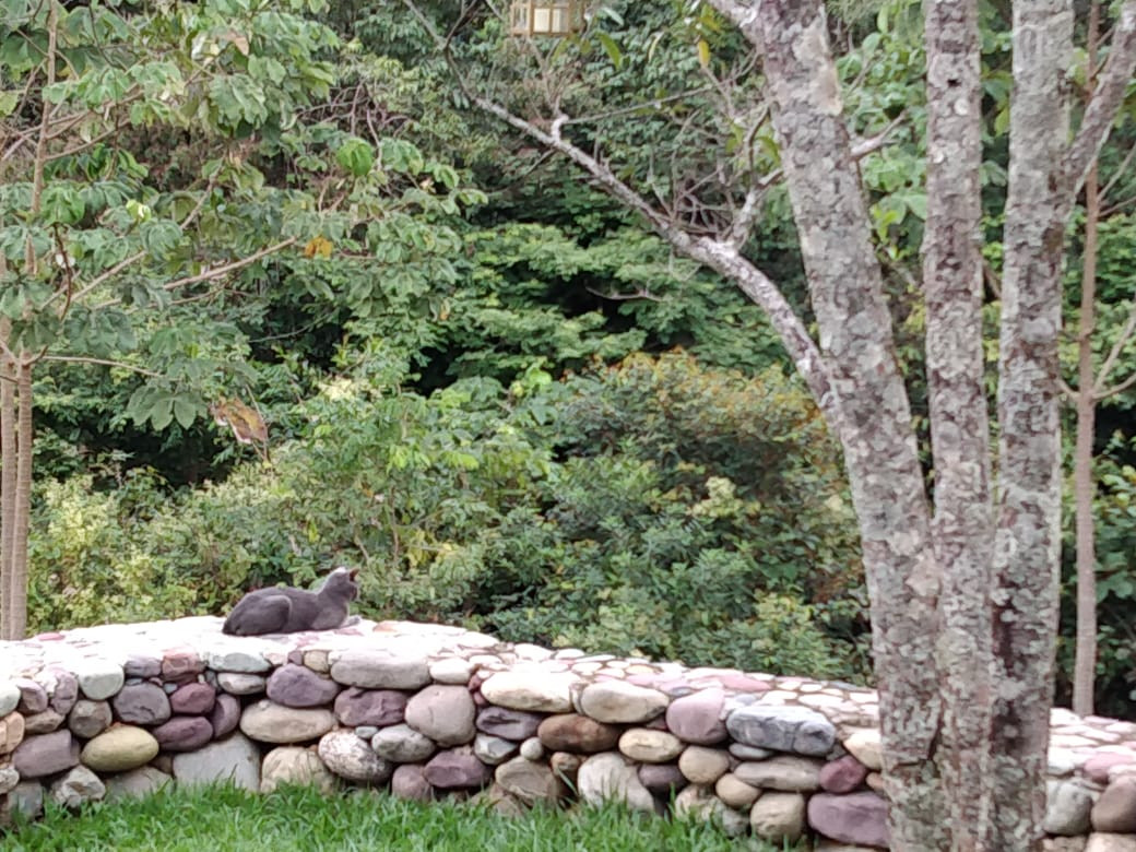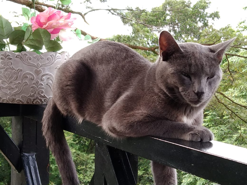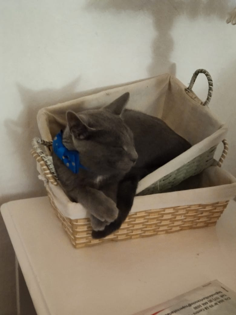 ✅ Es de color gris, tiene una manchita blanca en su pecho y una pequeña cicatriz en la pata delantera derecha. Es de tamaño mediano y tiene cola larga.