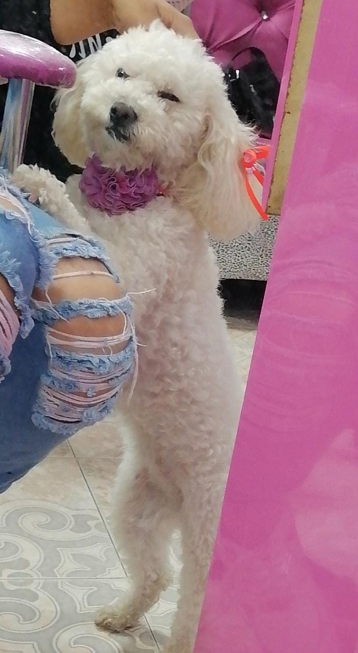 ✅ Es una perrita French Poodle pequeña, blanca y sin colita; tiene una manchita arriba de su colita.