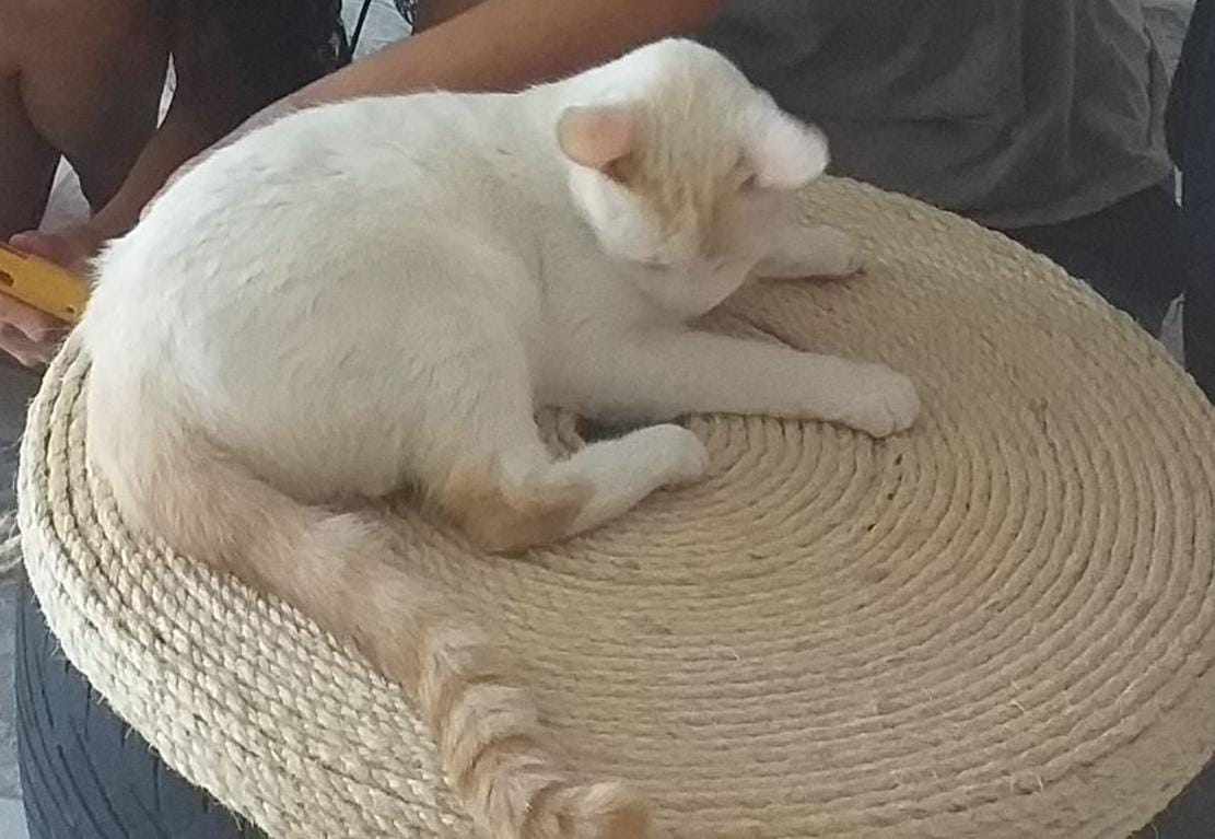 ✅ Gato blanco, ojos azules, con cola y orejas color beige.