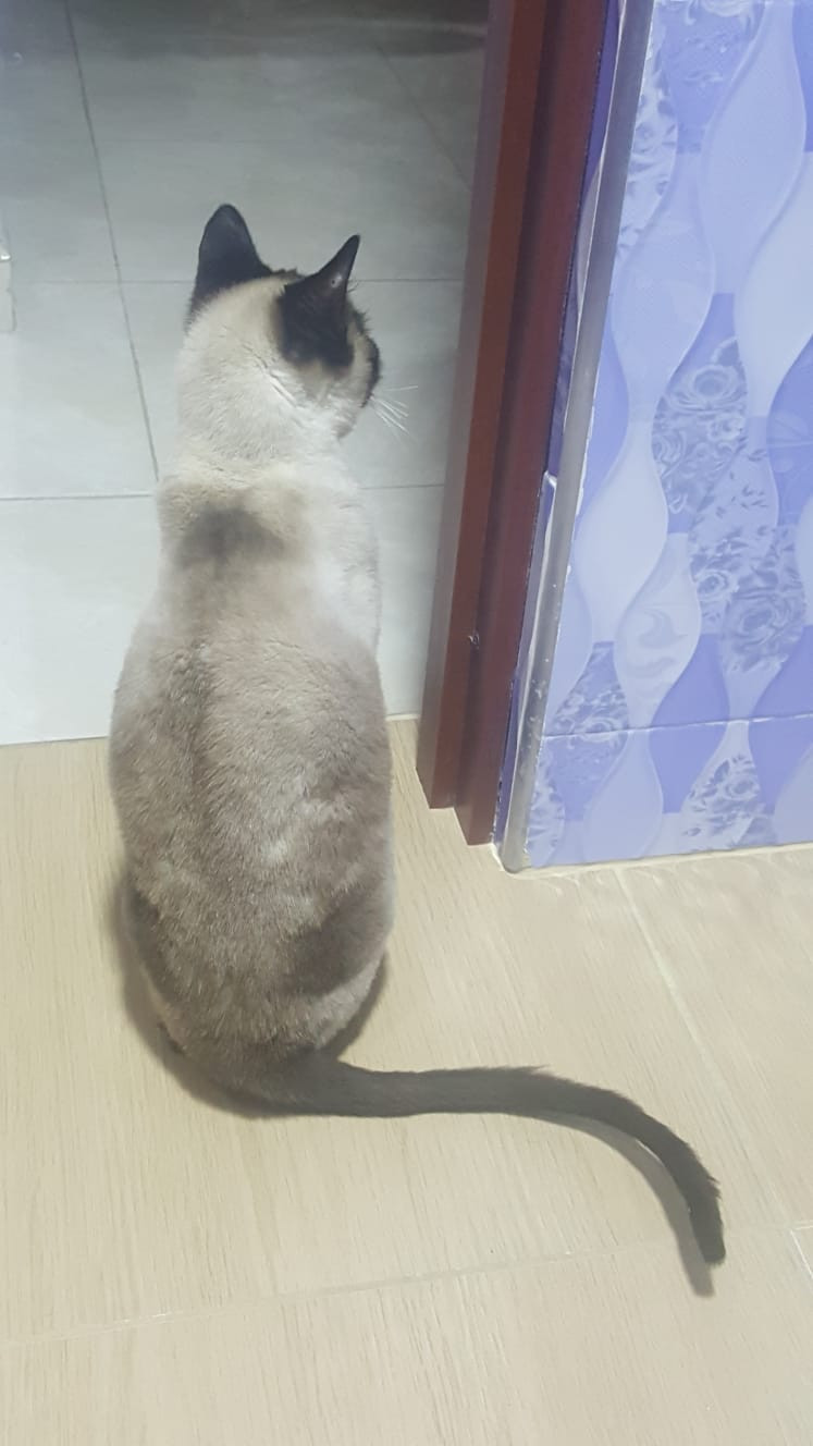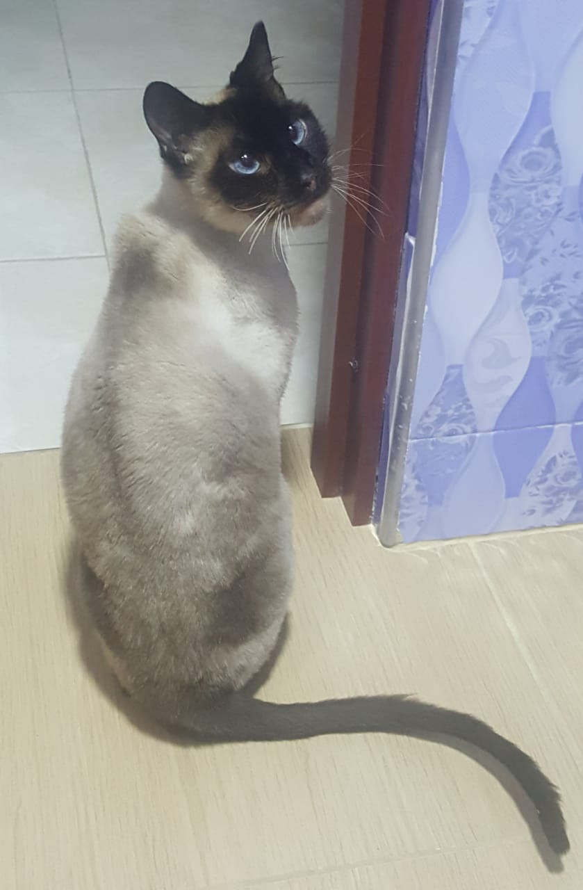 ✅ Es un gato de ojos azules, con estrabismo, es de pelo corto color y crema en el torso, sus patas, cabeza y cola café.