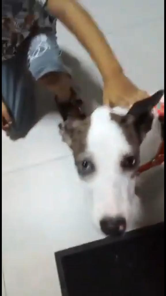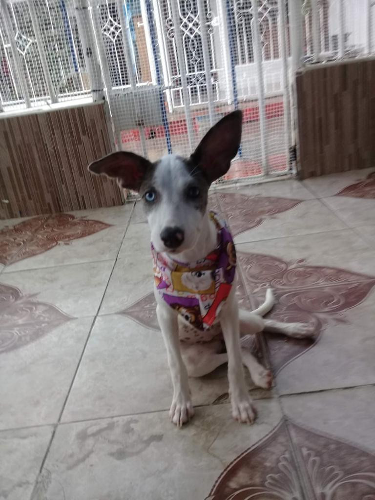 ✅ Es una perrita blanca con manchas grises, tiene un ojo azul y otro marrón.