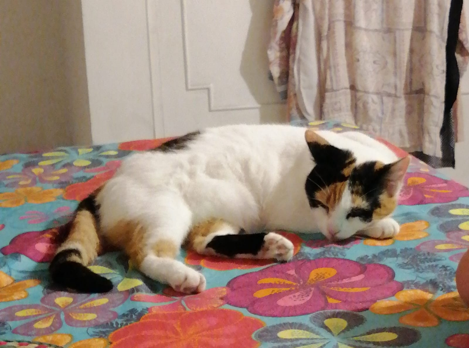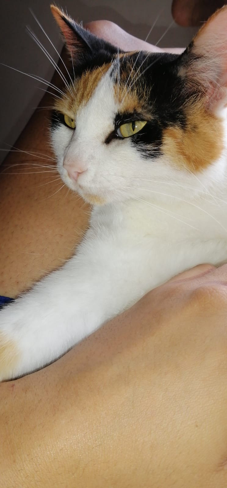 ✅ Es una gatica, en su mayoria es de color blanco, tiene manchas negras y naranjas. Su cola es mayormente negra con manchas naranjas, sus ojos son verdes.