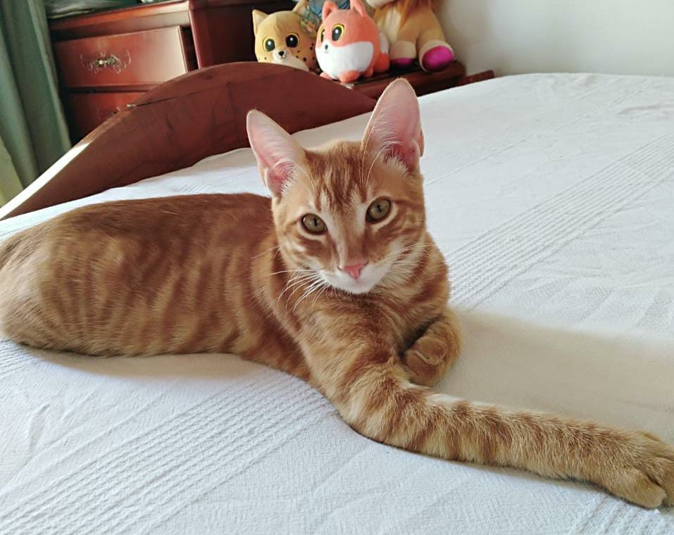 ✅ Es un gatico amarillo con rayas más oscuras, sus ojos son amarillos y en la parte de la boquita es blanquito.