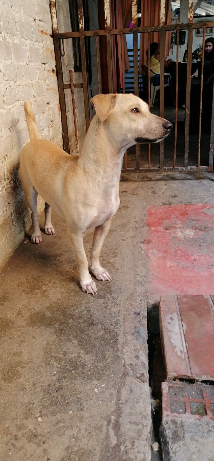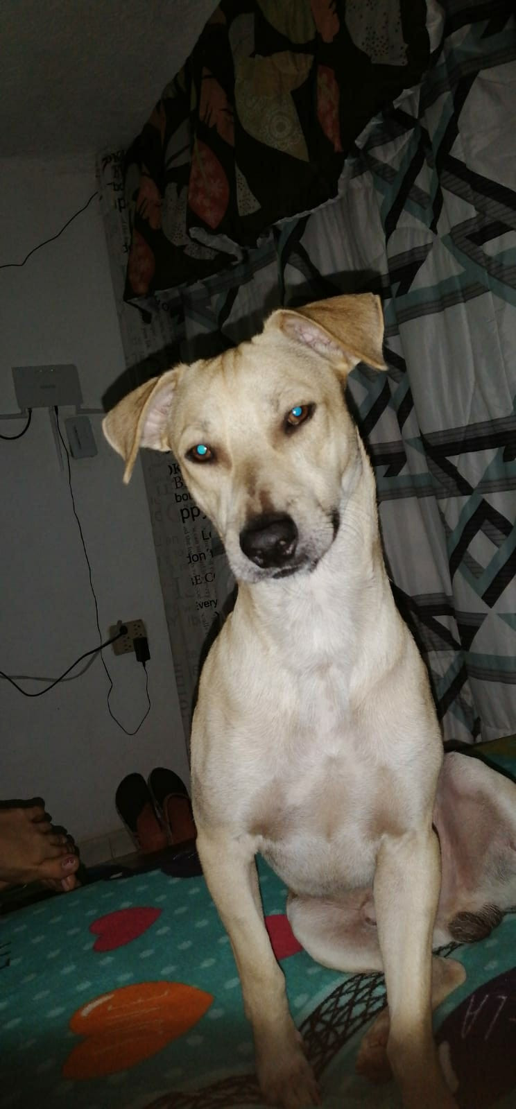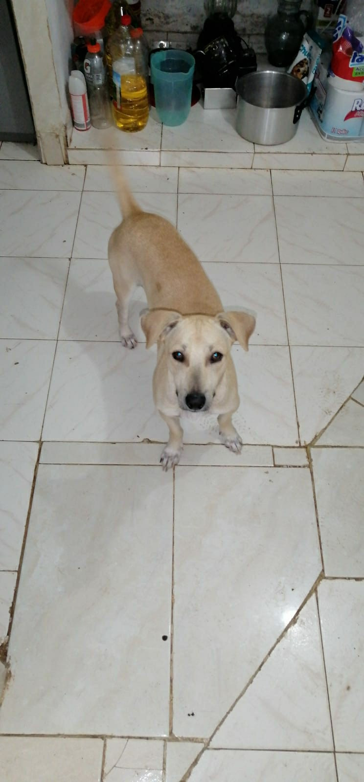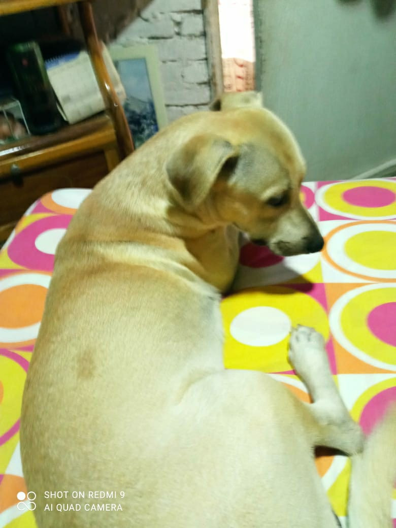 ✅ Es de color beige, delgado tamaño mediano tiene los ojos claros, entre la espalda y la cadera tiene una mancha tipo lunar en su pelo, el pelaje es corto.