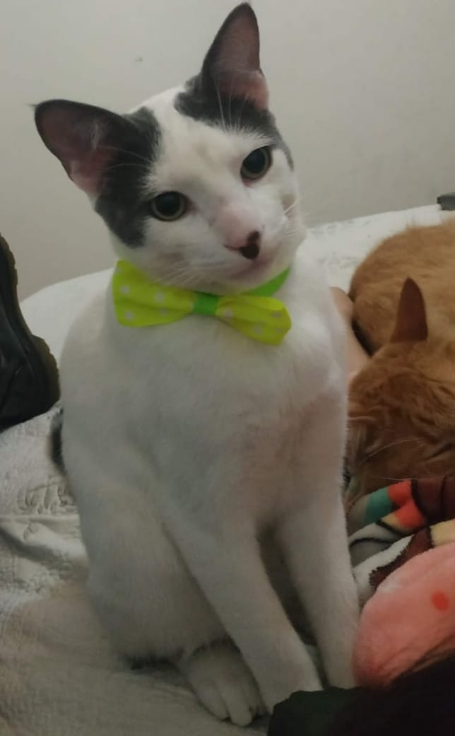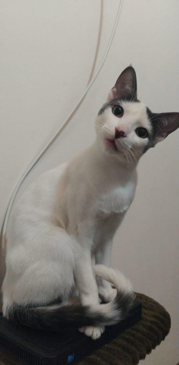 ✅ Gatito macho Blanco con orejitas y colita gris-negra,su patita trasera derecha tiene una mancha gris-negra, en su nariz tiene una mancha negra.