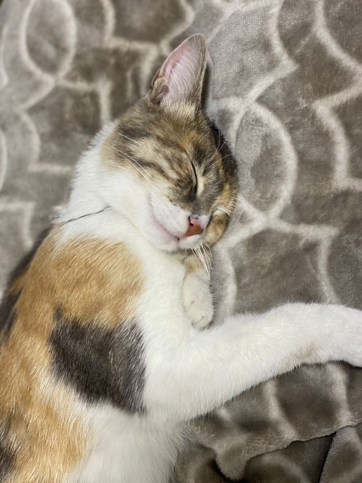 ✅ Es una gata criolla color calico (amarillo, cafe y blanco). Es pequeña con ojos verdes.