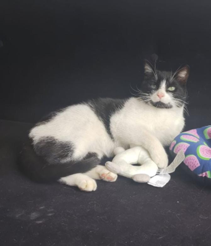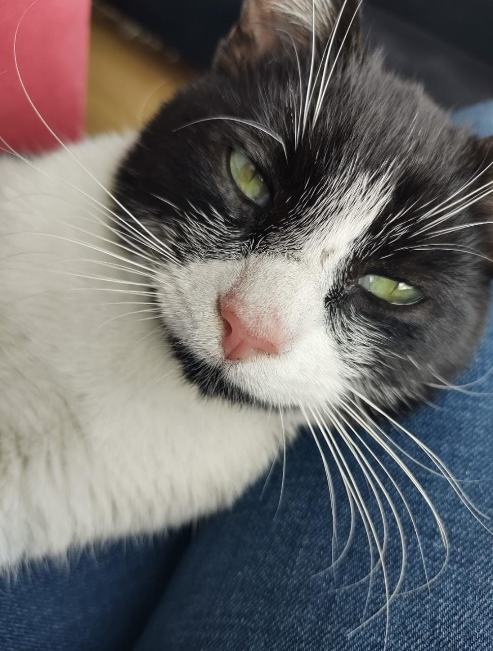 ✅ Es un gato blanco con negro, tiene una mancha negra en el mentón, nariz rosada, ojos verdes, está castrado, tiene un tatuaje en la oreja derecha en forma de circulo. Es muy noble y amigable.