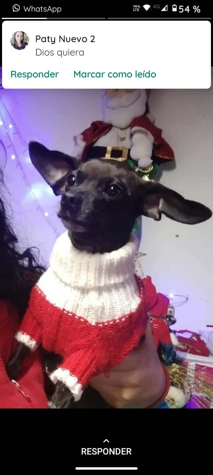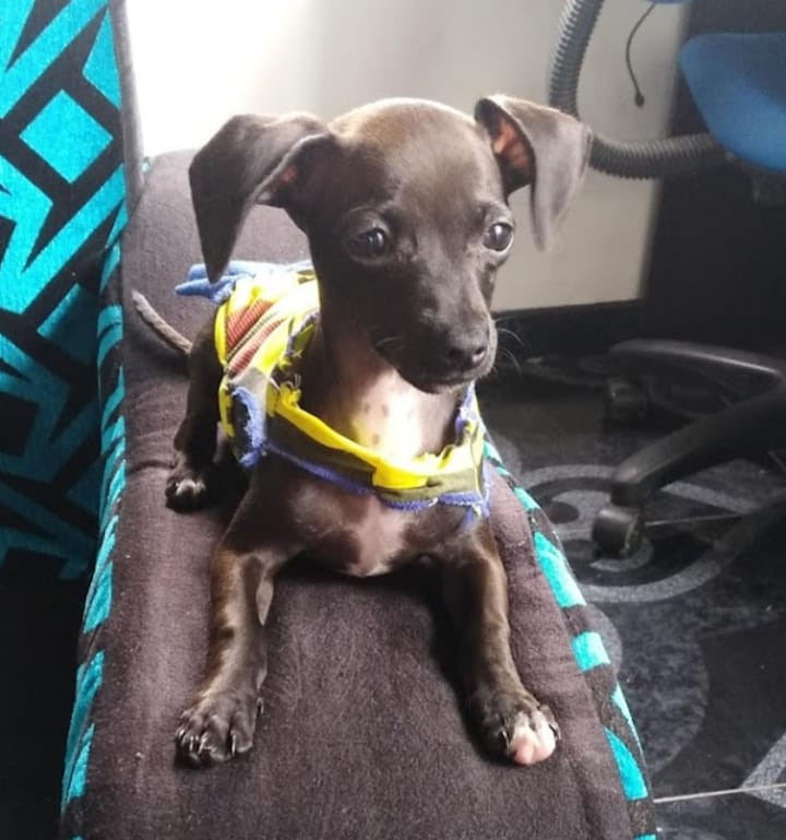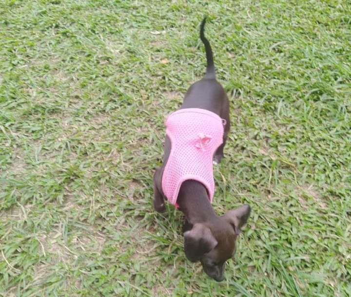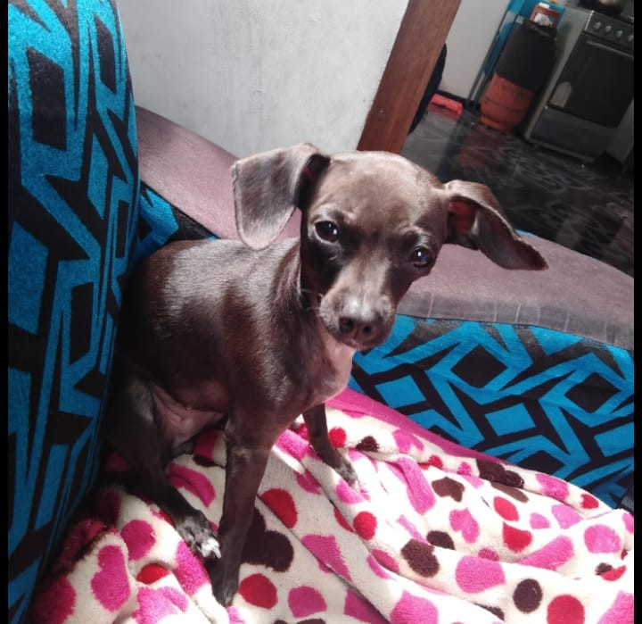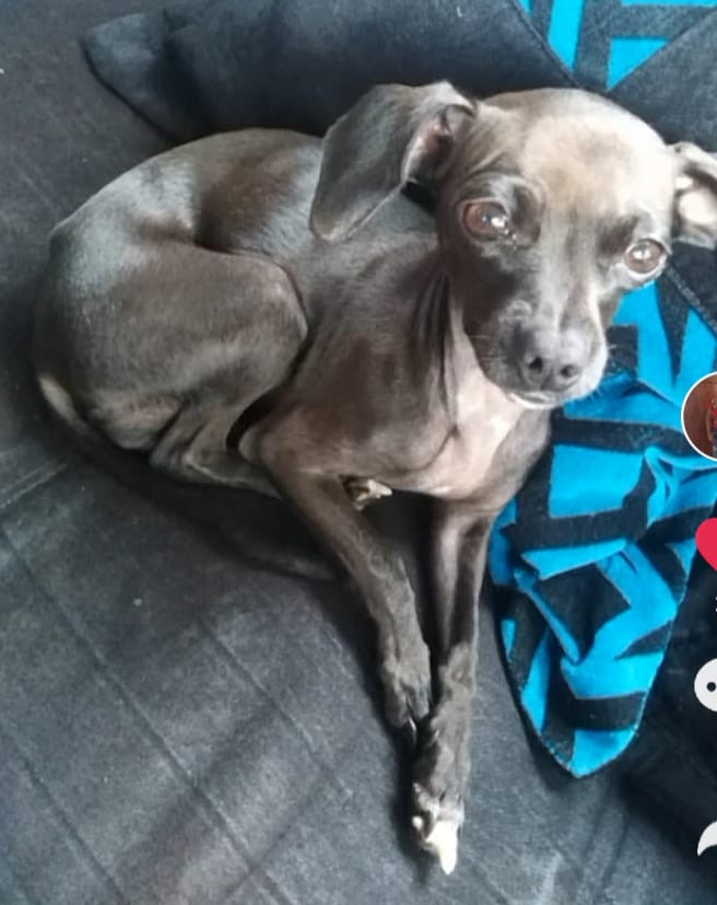 ✅ Es una perrita pincher color negro con blanco en el pecho desde su mentón orejas caídas sin cortar, cola larga, su patica derecha tiene dos uñas blancas.