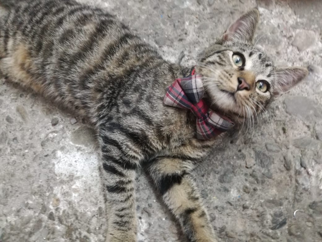 ✅ El es pequeño, es de color gris con rayas negras como atigrado.