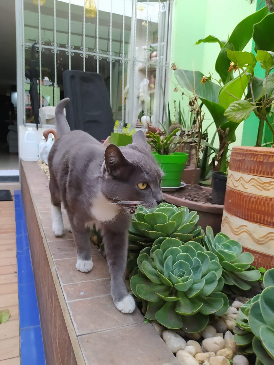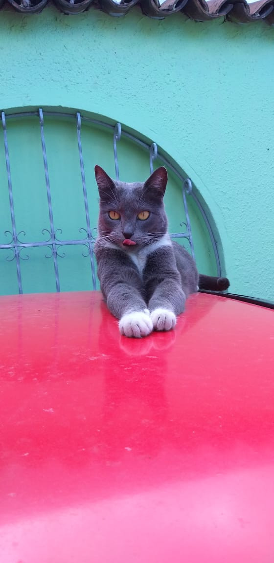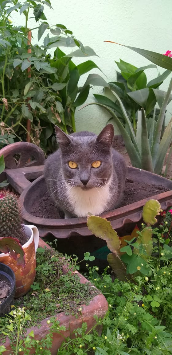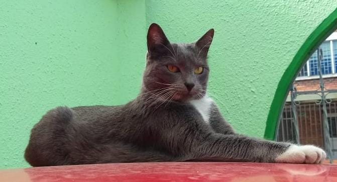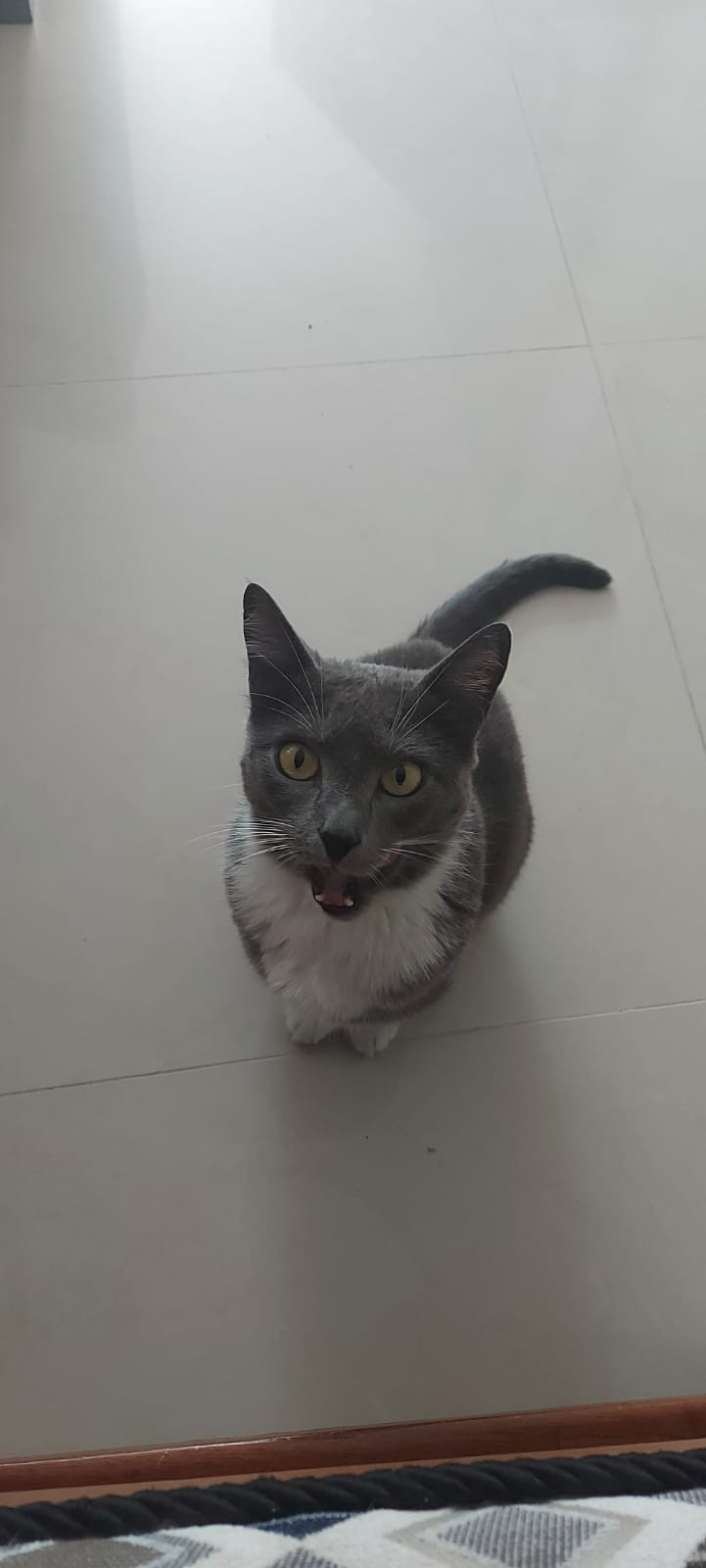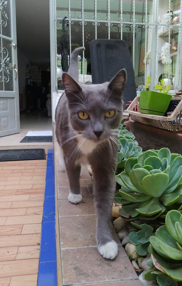 ✅ Saori es una gatica de color gris, es de pelaje corto, tiene el pecho blanco en forma de V, tambien tiene guantes y botas blancas en sus 4 paticas, sus ojos son amarillos, con una pequeña mancha de pelos blancos al lado derecho del mentón, la nariz gris oscura, y los bigotes y las cejas son blancos.