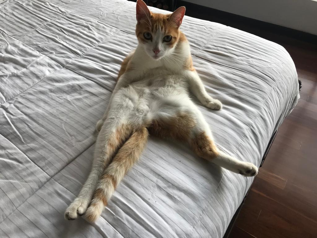 ✅ Es una gatica de color amarillo con blanco, es de ojos verdes y su naricita es rosada, le cuelga la piel de la barriga.