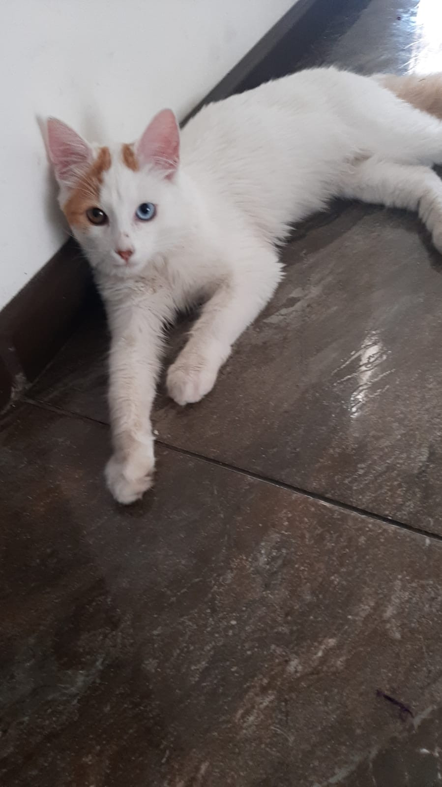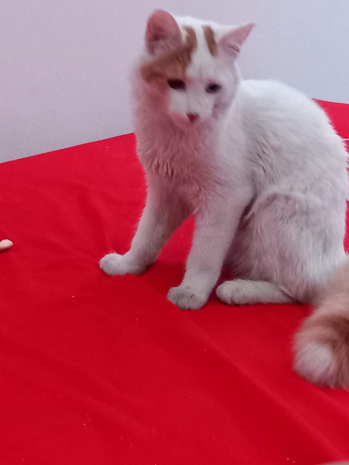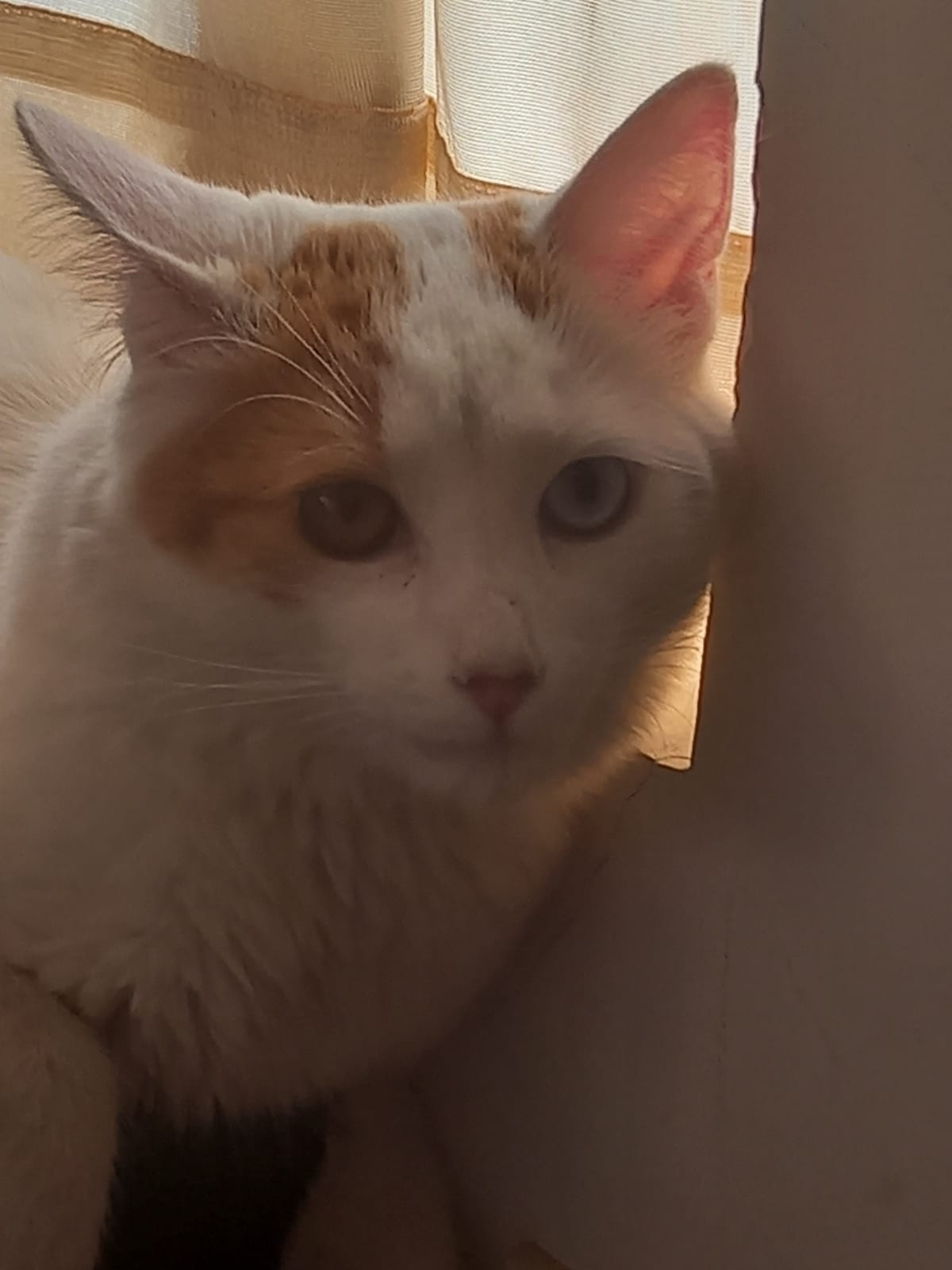 ✅ Gatito blanco con heterocromia, un ojito azul y otro café. Unas manchitas amarillas en la cabecita y la cola.