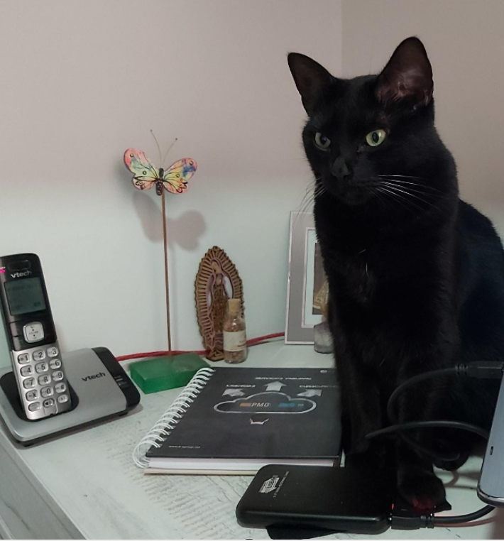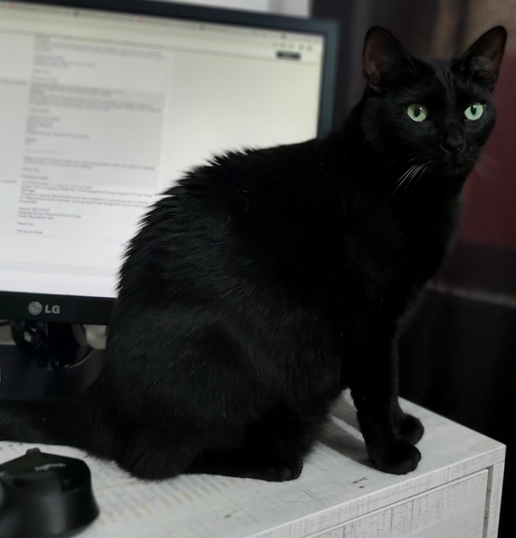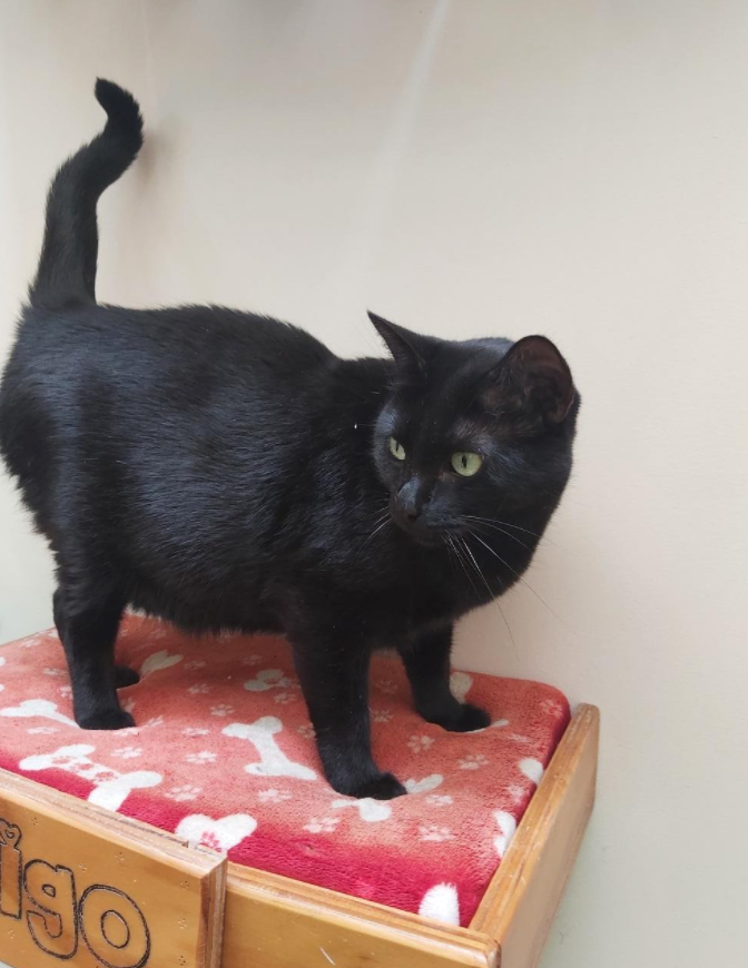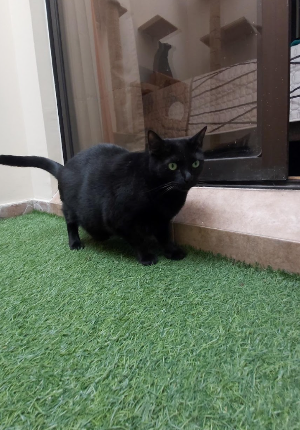 ✅ Es una gatica gordita, pequeña, negrita completamente, de BIGOTES BLANCOS y OJOS VERDES.