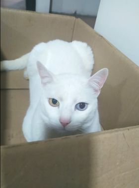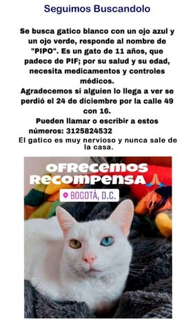 ✅ Es un gatico, macho, de color blanco, tiene un ojo verde y un ojo azul, está castrado, está enfermo tiene PIF, nunca salía del apartamento. Necesita controles médicos por su edad y estado de salud.
