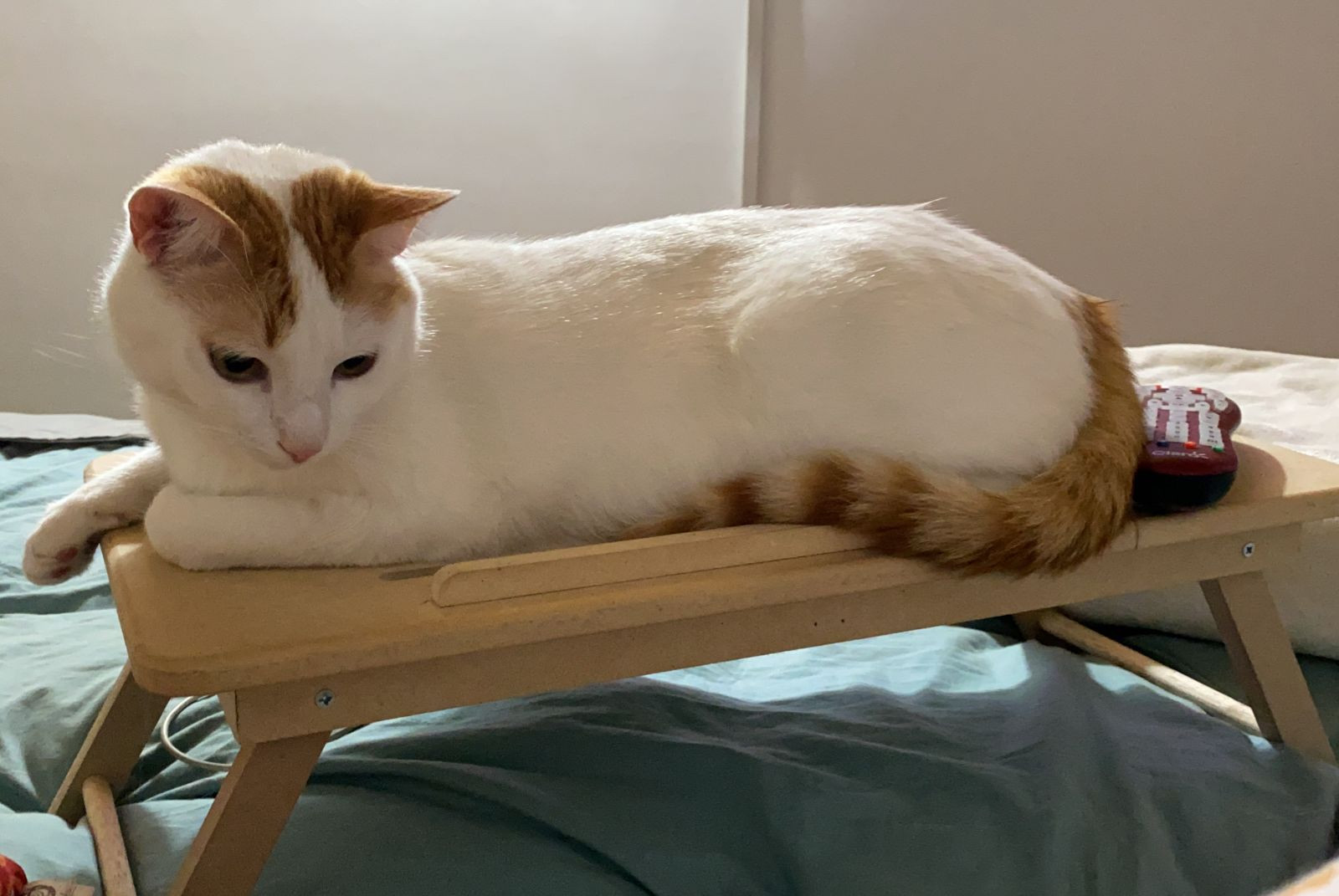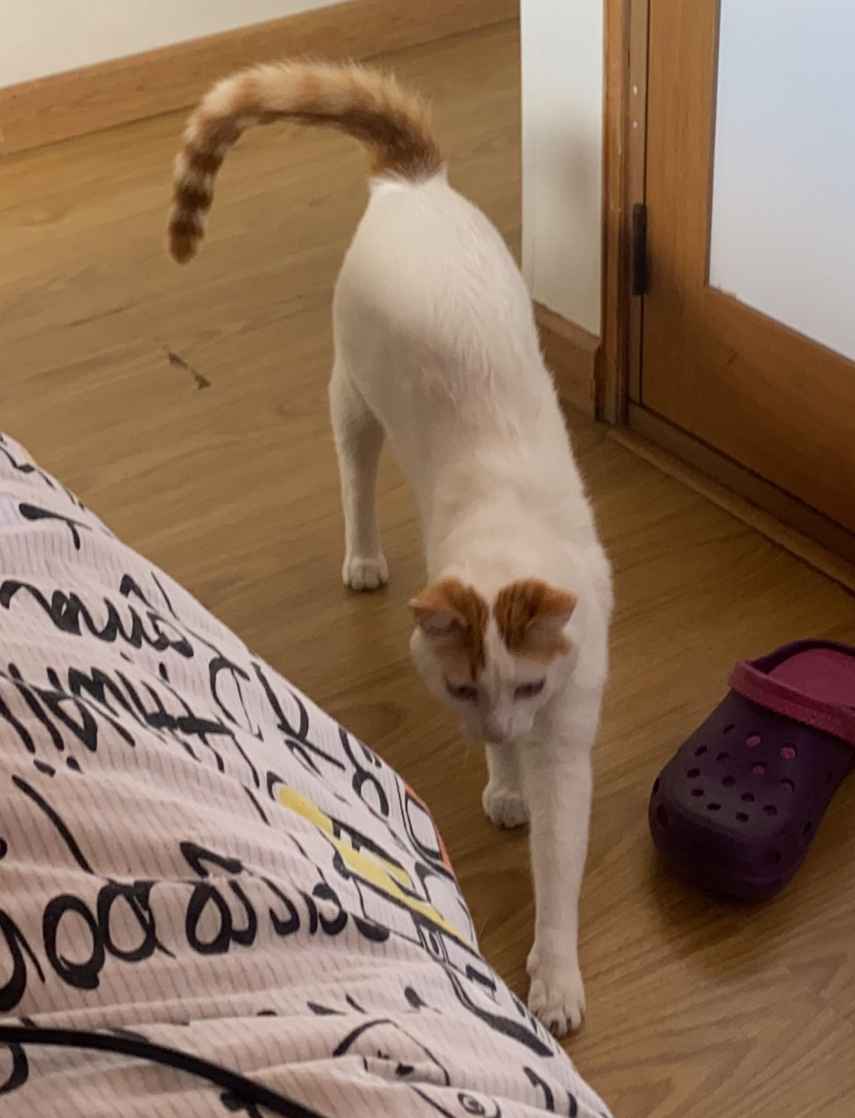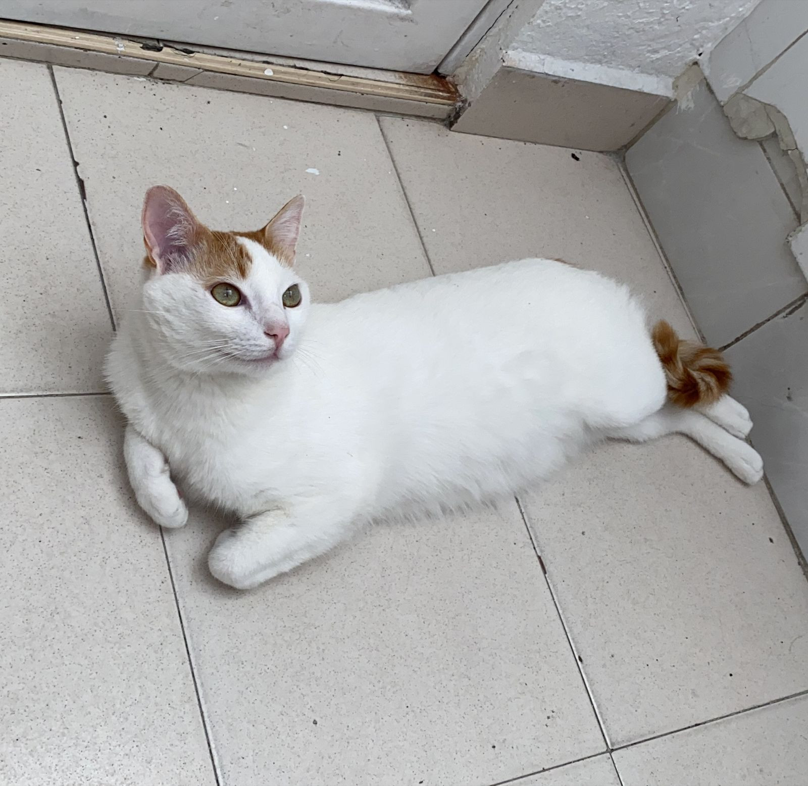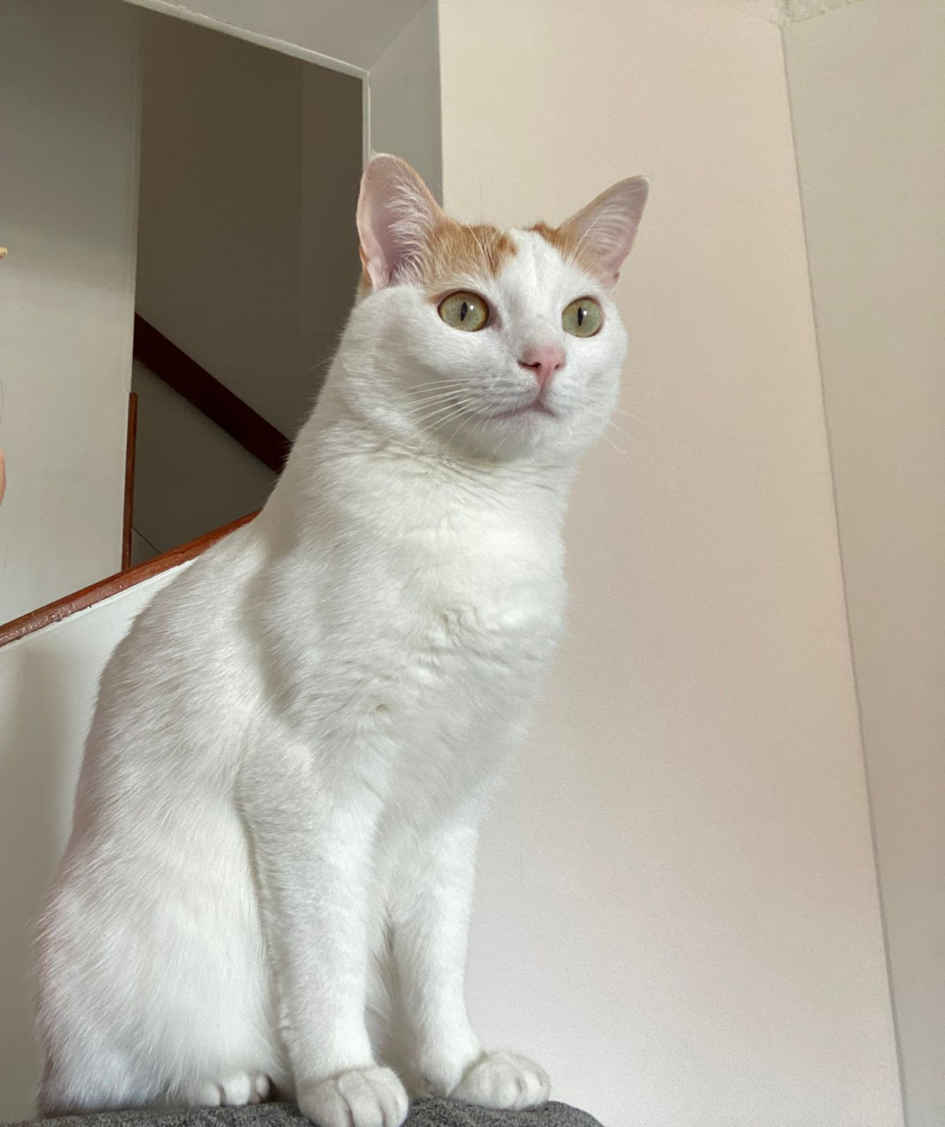 ✅ Es de color blanco todo su cuerpo, ojos verde limón, y sus orejas y cola son de color miel.