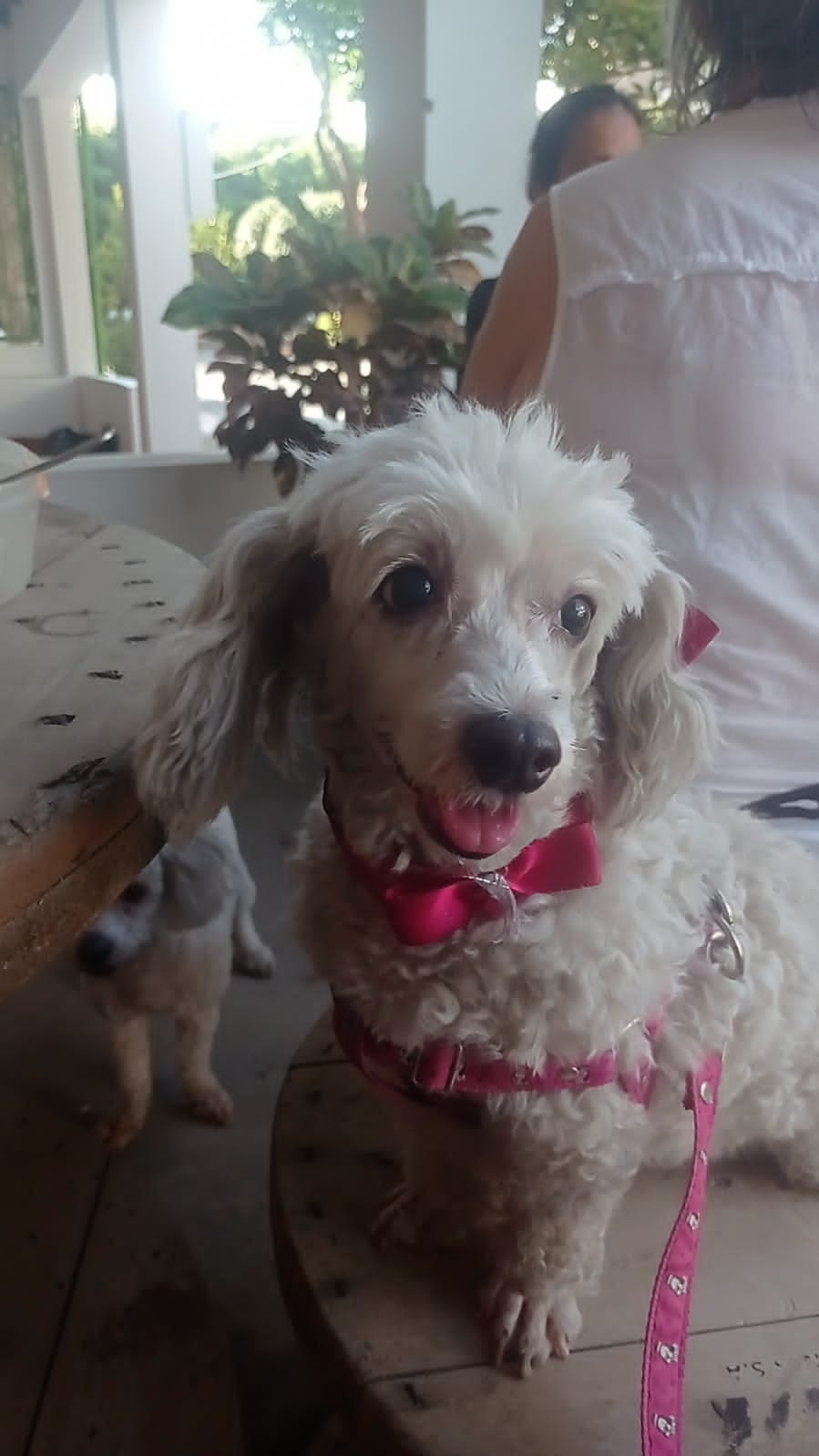 ✅ Ella es pequeña de color blanco perla Debe pesar unos 7 a 8 kg. Es de patas cortas, es peluda. Está un poco sucia porque estamos arreglando la casa y ella se ensucia muy fácilmente.