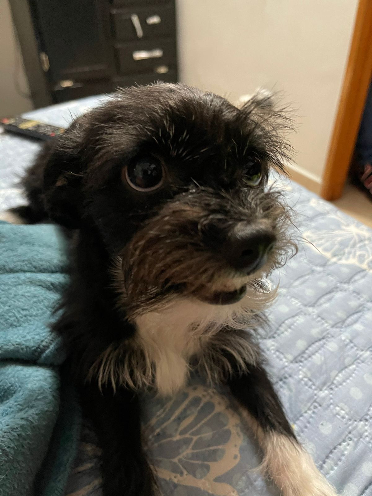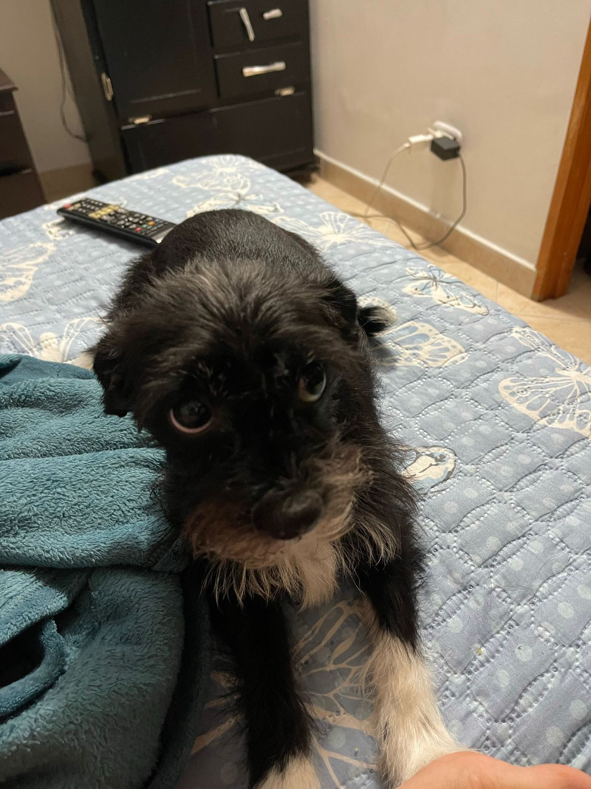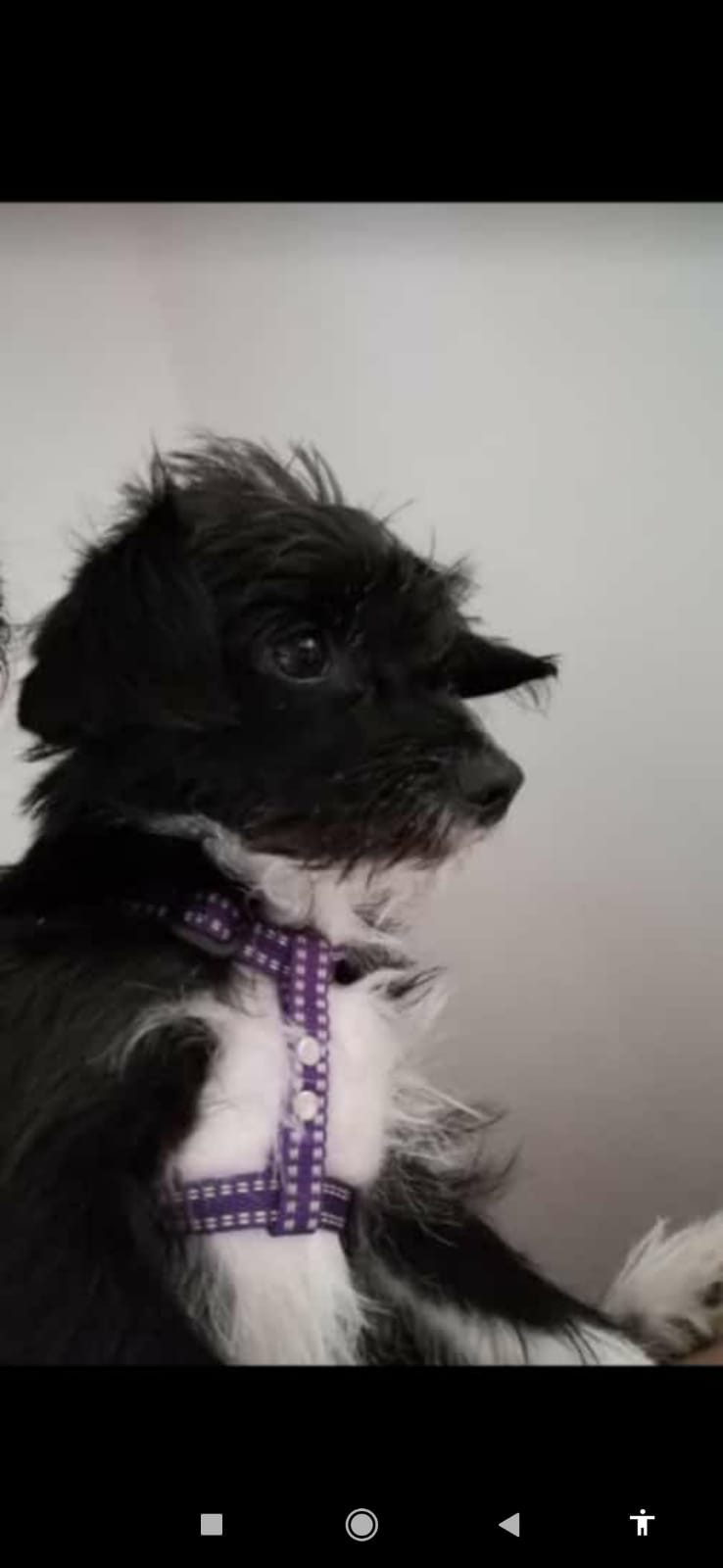 ✅ Es una perrita de tamaño pequeño, es de color negro, su pecho es blanco y sus patas son blanquitas como si tuviera zapaticos y en el cuello tiene pelito blanco y es tiene barbas.
