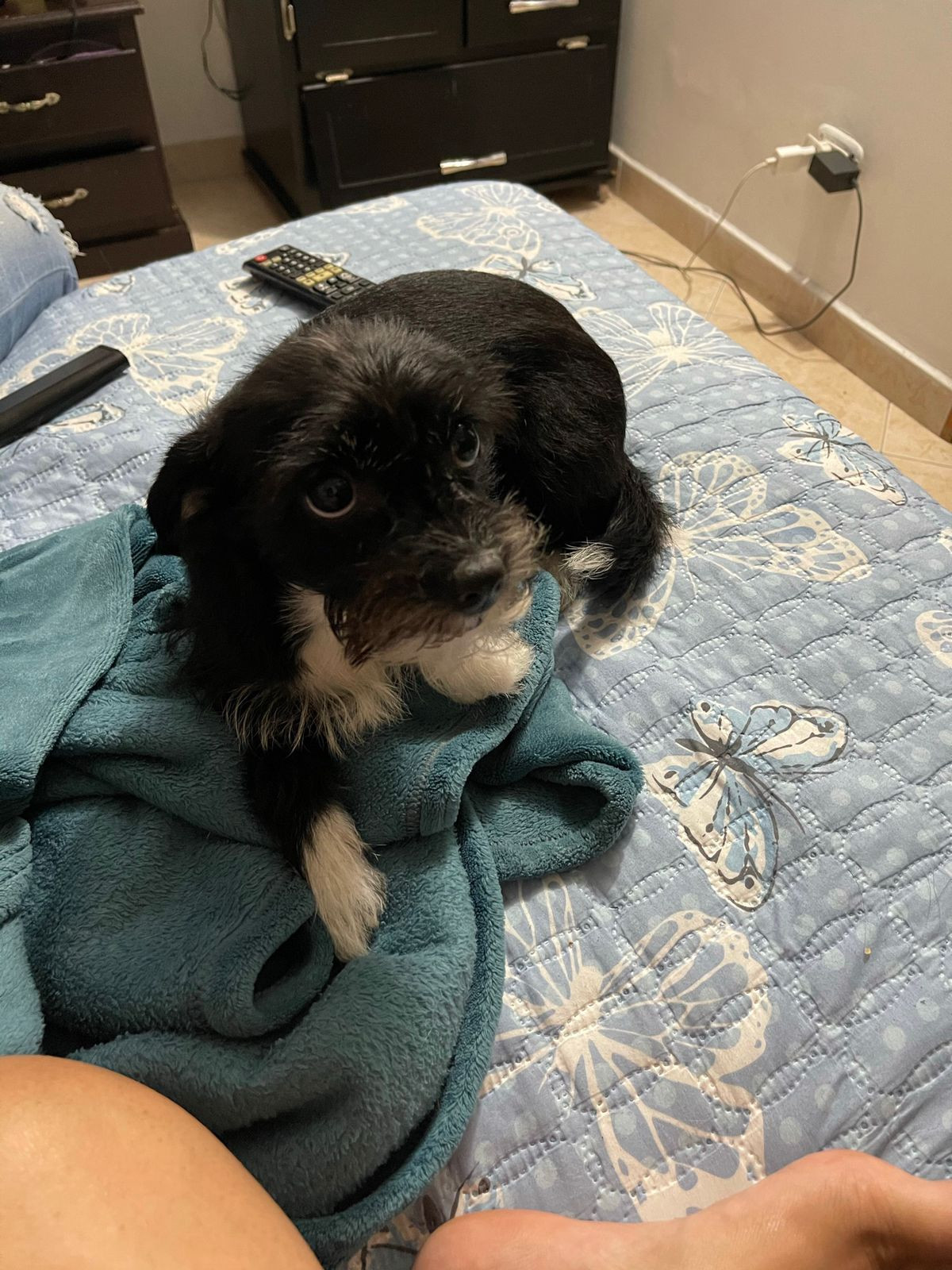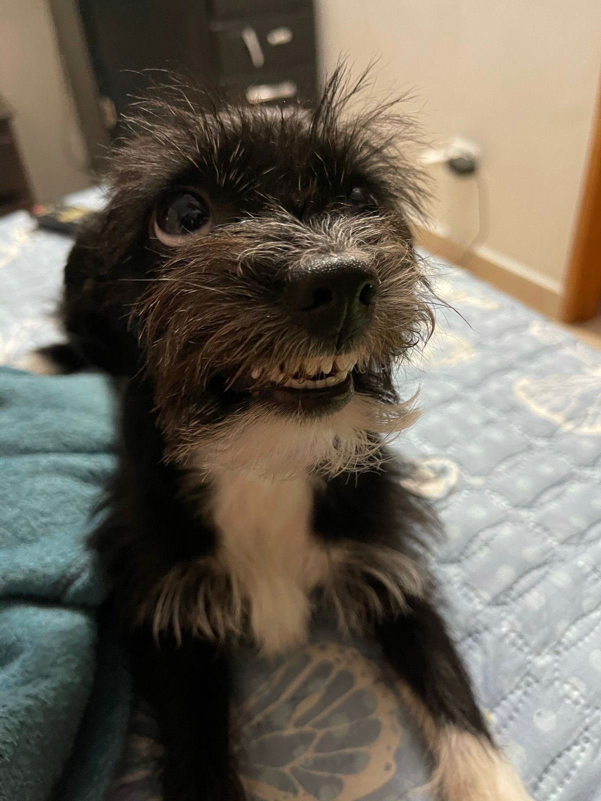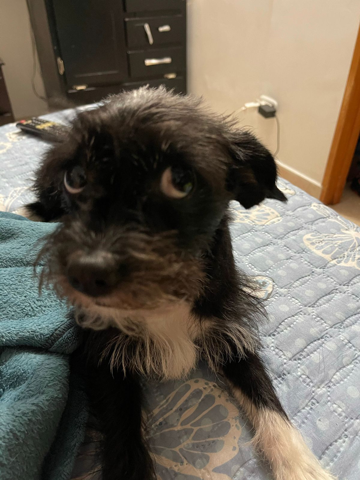 ✅ Es una perrita de tamaño pequeño, es de color negro, su pecho es blanco y sus patas son blanquitas como si tuviera zapaticos y en el cuello tiene pelito blanco y es tiene barbas.