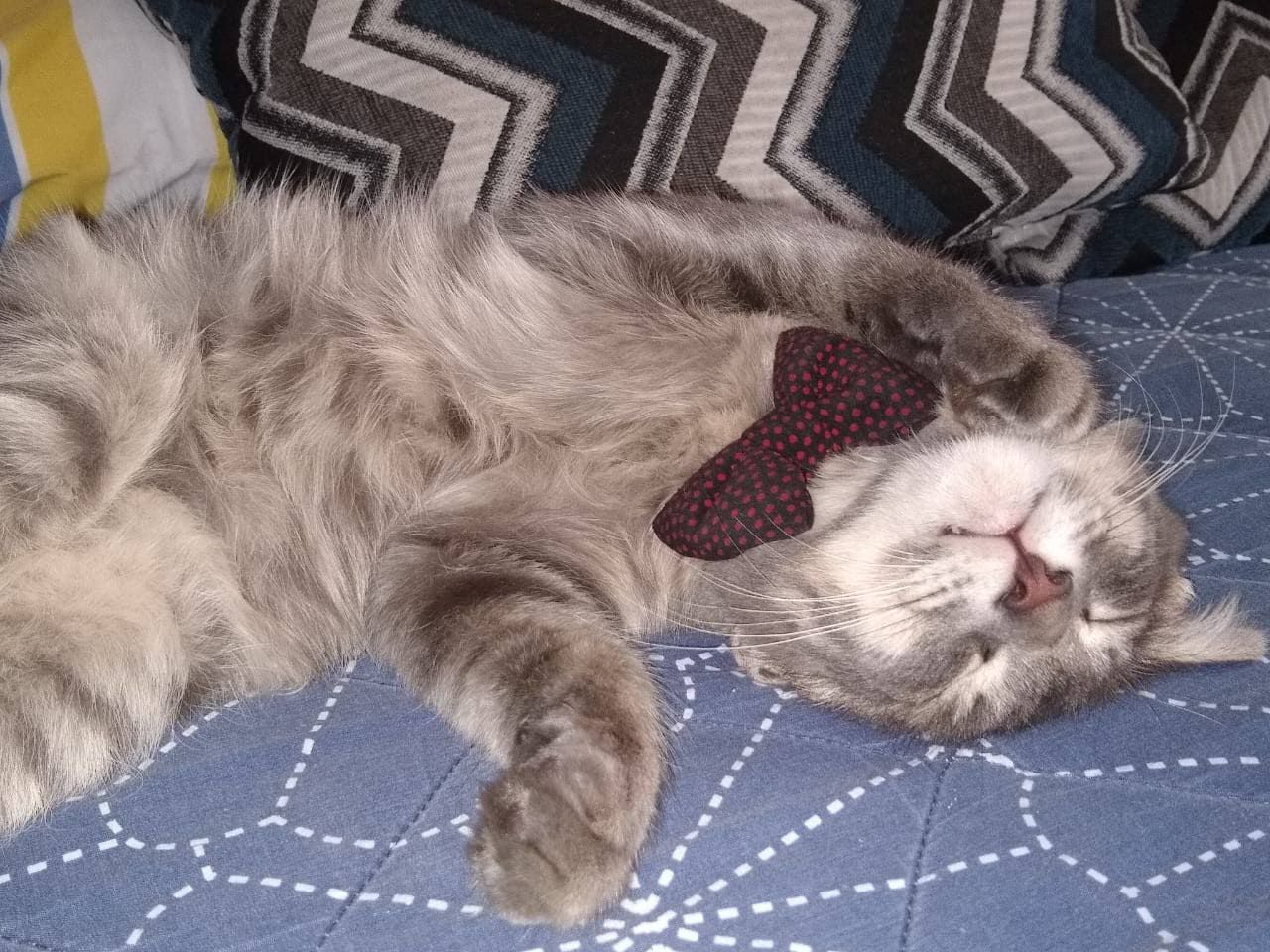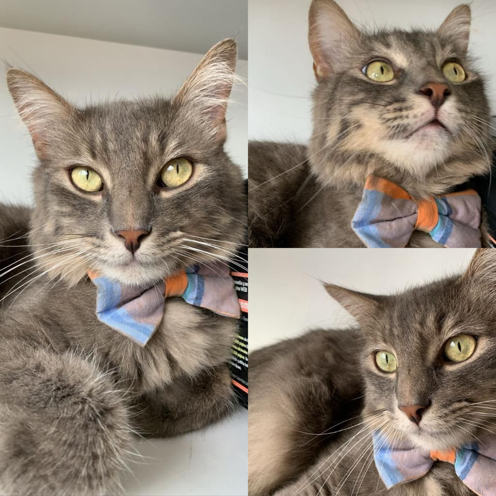 ✅ En el momento que se extravió tenía puesto un corbatín color lila con azul y naranja.