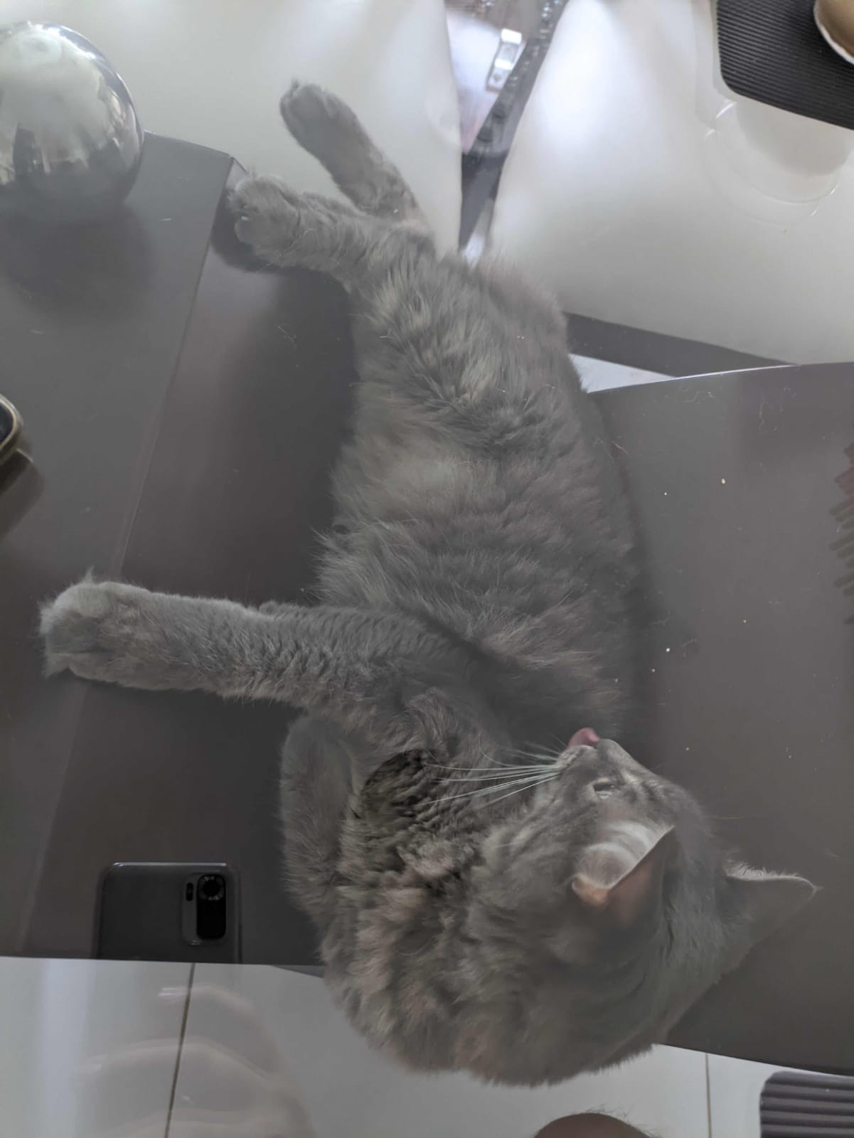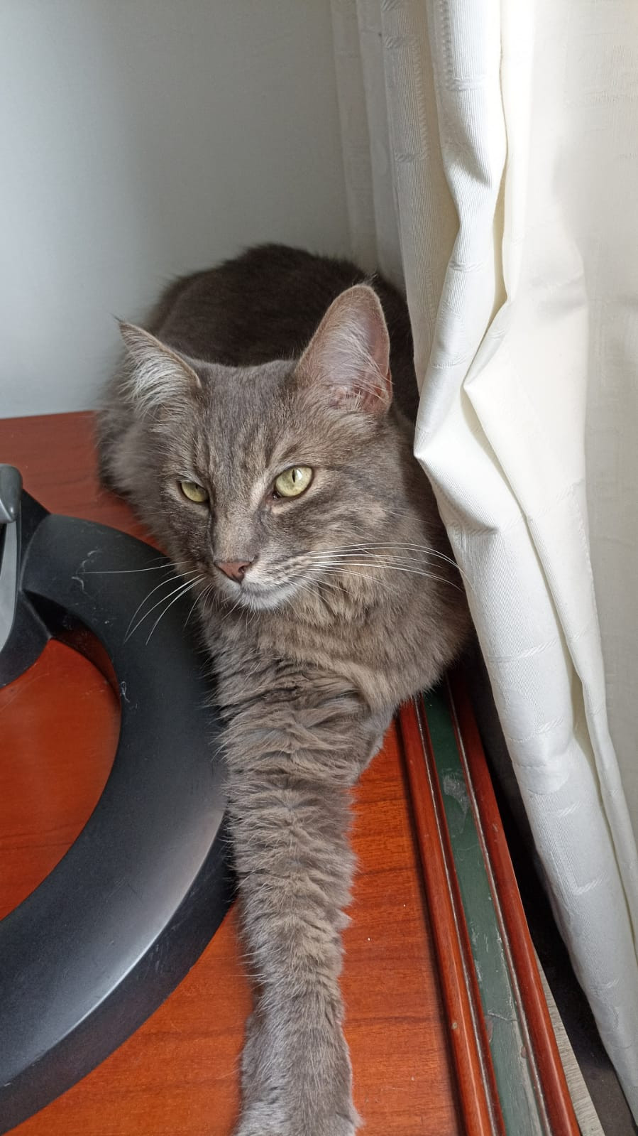 ✅ Es muy peludo, tiene la cola muy peluda. Es de varios tonos de gris, *no* tiene pintas blancas.