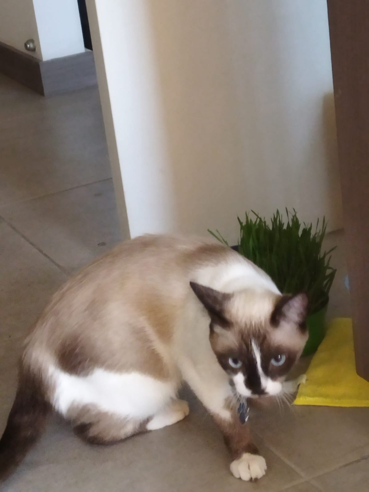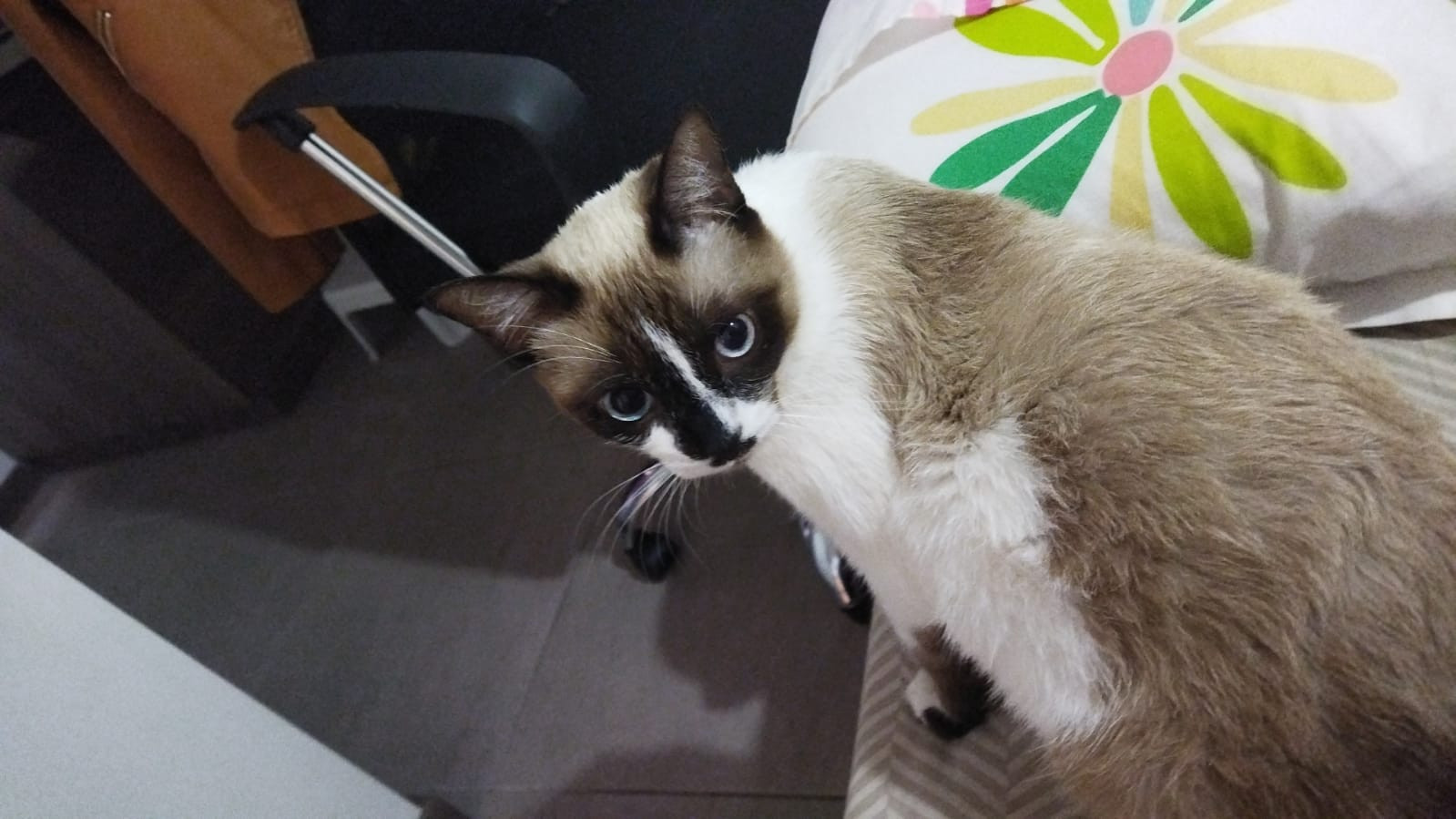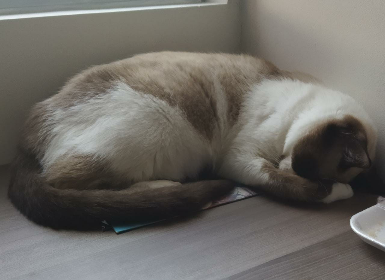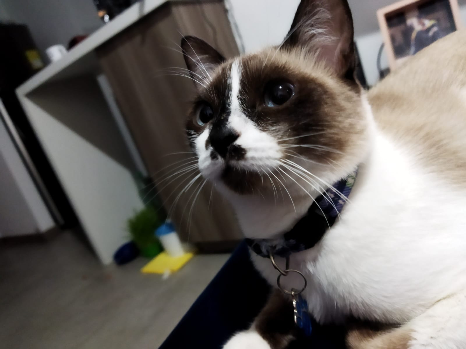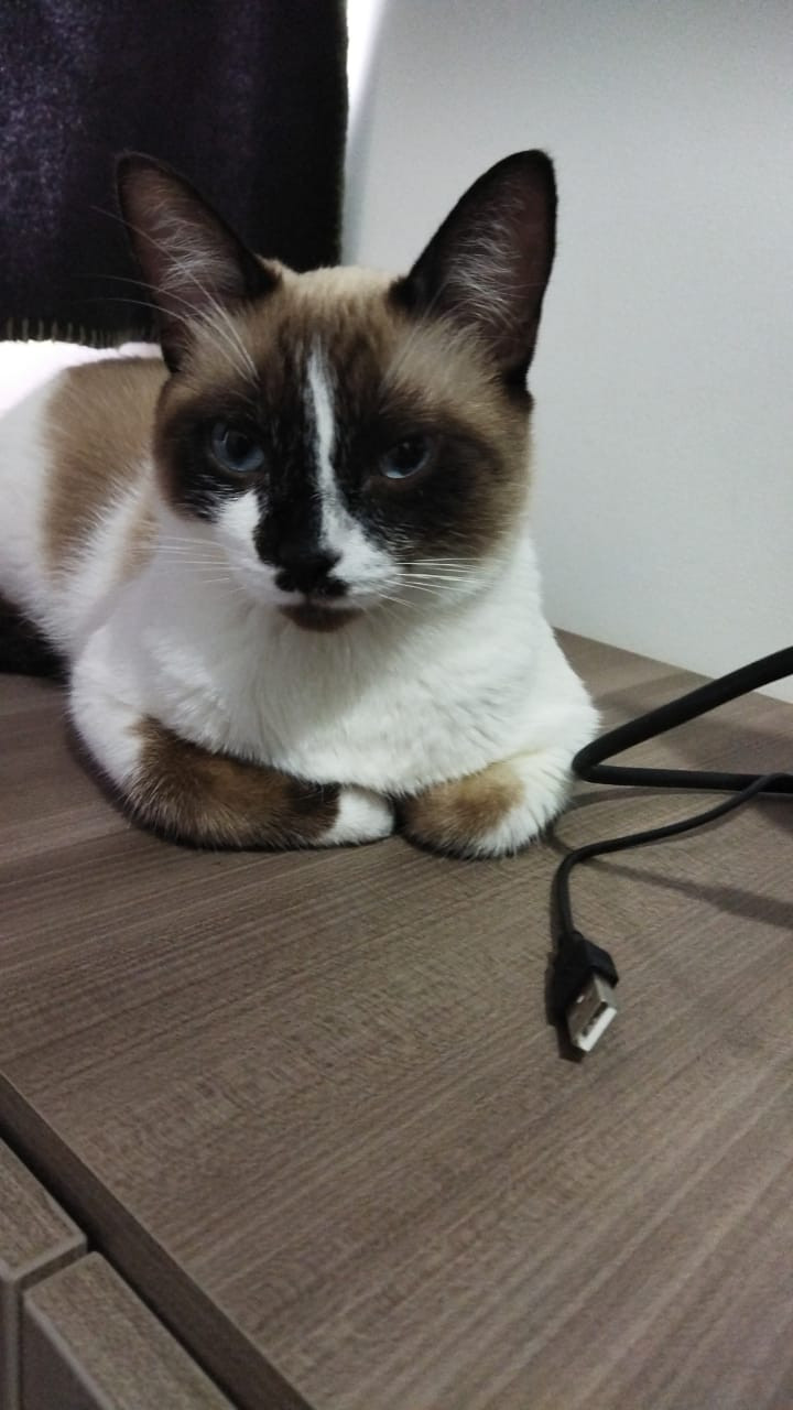 ✅ Blanco con café y beige, puede parecer un siames con manchas muy blancas, tiene un mostacho en el hocico café oscuro. Tiene ojos azules redondos.