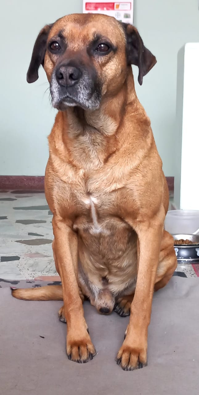✅ Es un perrito de tamaño mediano, color caramelo, tiene las orejas color café oscuro, pesa aproximadamente 25 kilos, tiene una mancha pequeña blanca en el pecho, no tiene algunos dientes en la parte inferior de la boca, en el hocico tiene algunas canas.