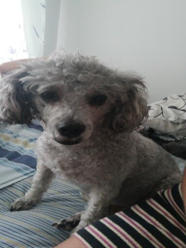 ✅ Enrazado con french poodle, color gris, trata de tener unas manchitas negras en el lomo, está más peludito que en las fotos.