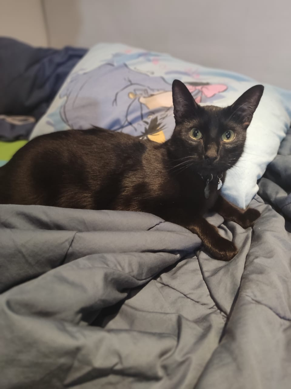 ✅ Es un gatito, macho, de pelaje negro, es delgado, su cabeza es pequeña, sus ojos son verdes y tiene un tatuaje de corazón en la oreja derecha.
