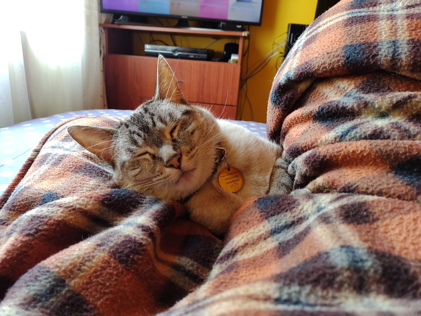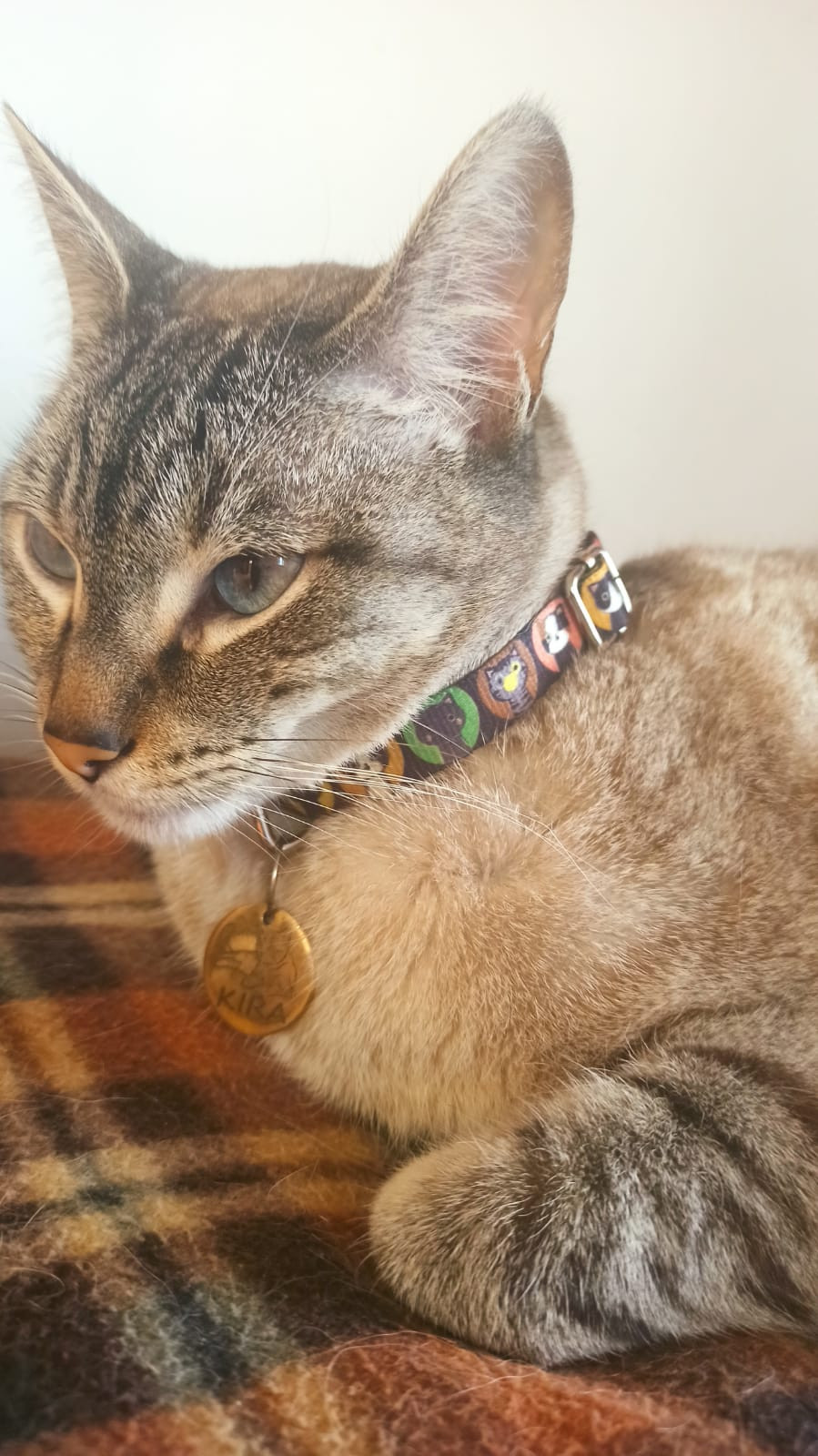 ✅ Tenia collar con un estilo de dibujos y su placa redonda color dorado en el que tiene dibujado un gato encima del nombre de ella y en la parte de atras los numeros de contacto.
