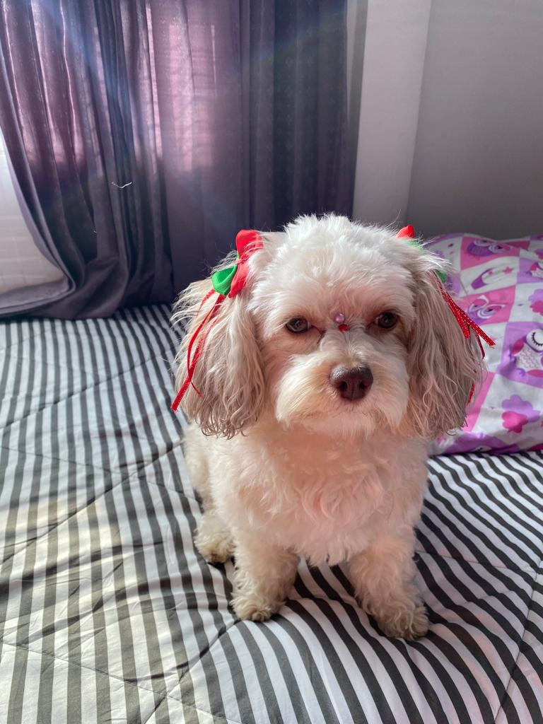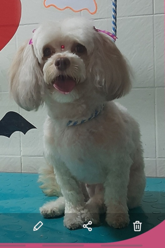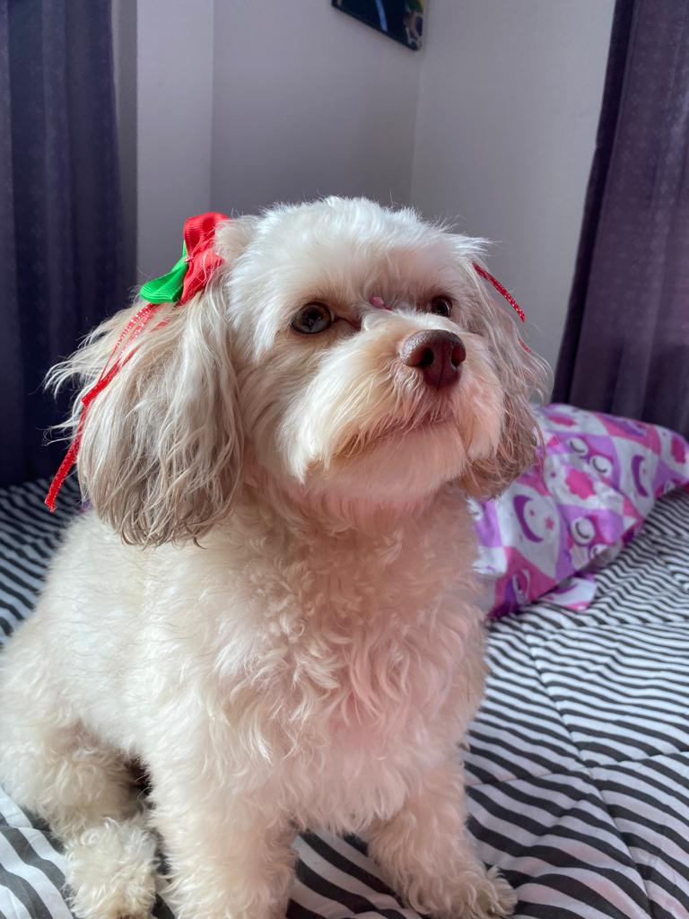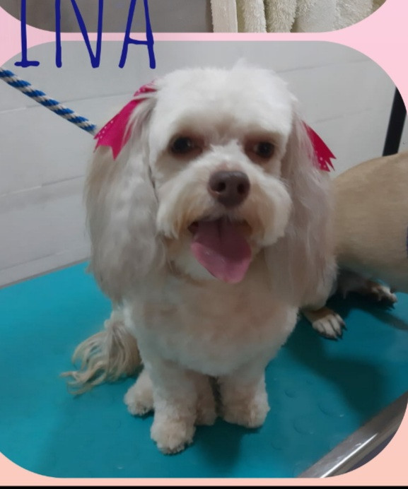 ✅ Es una perrita, de raza pequeña, el pelo es ondulado, es blanca con pelitos dorados, esta recién peluqueada, sus ojos son cafés claros y la nariz es cafe. Tiene una raspadura debajo del cuello.