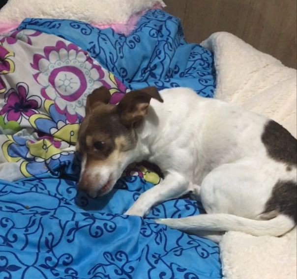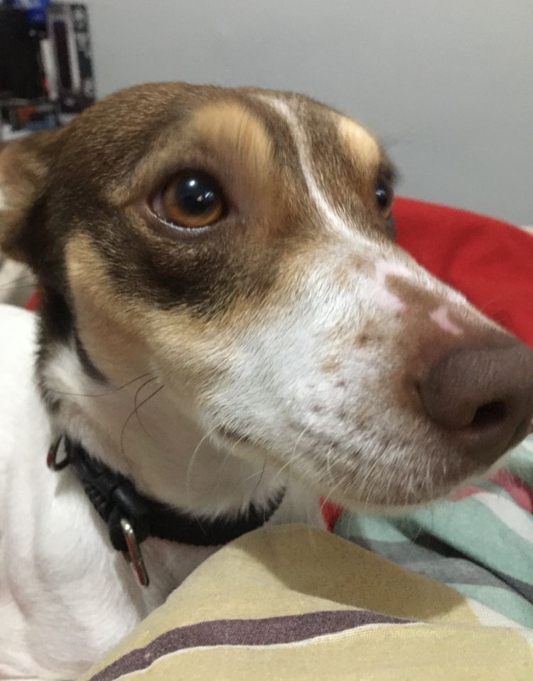 ✅ Es blanca con manchas cafés en su cabeza y en la espalda, tiene orejas grandes, una no la puede levantar del todo.