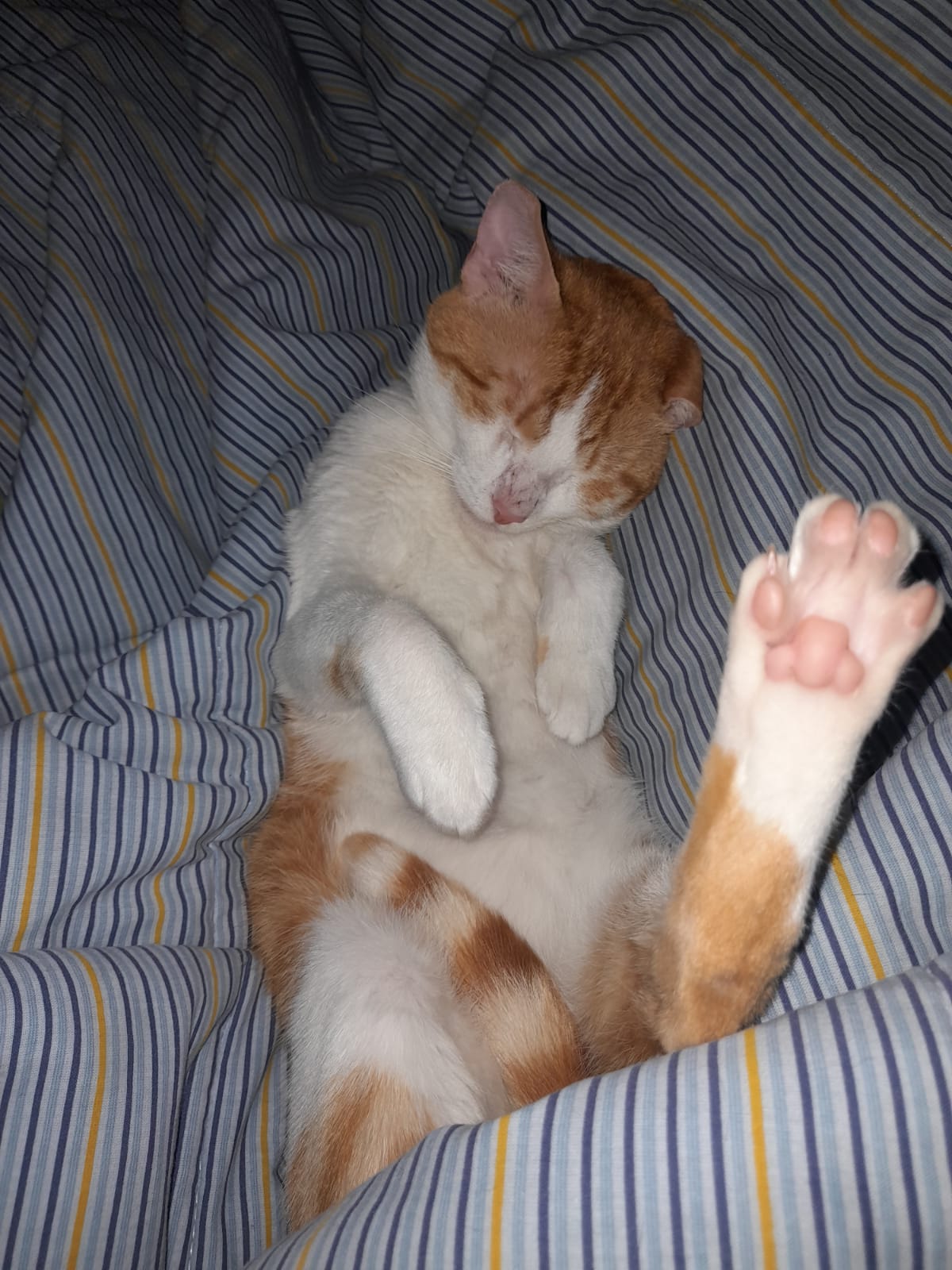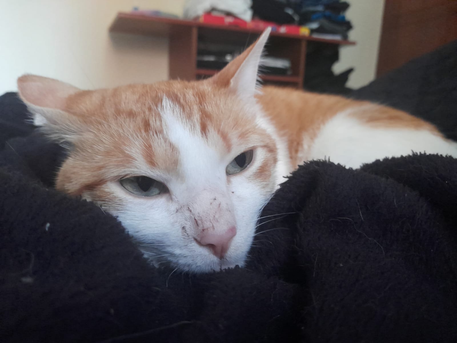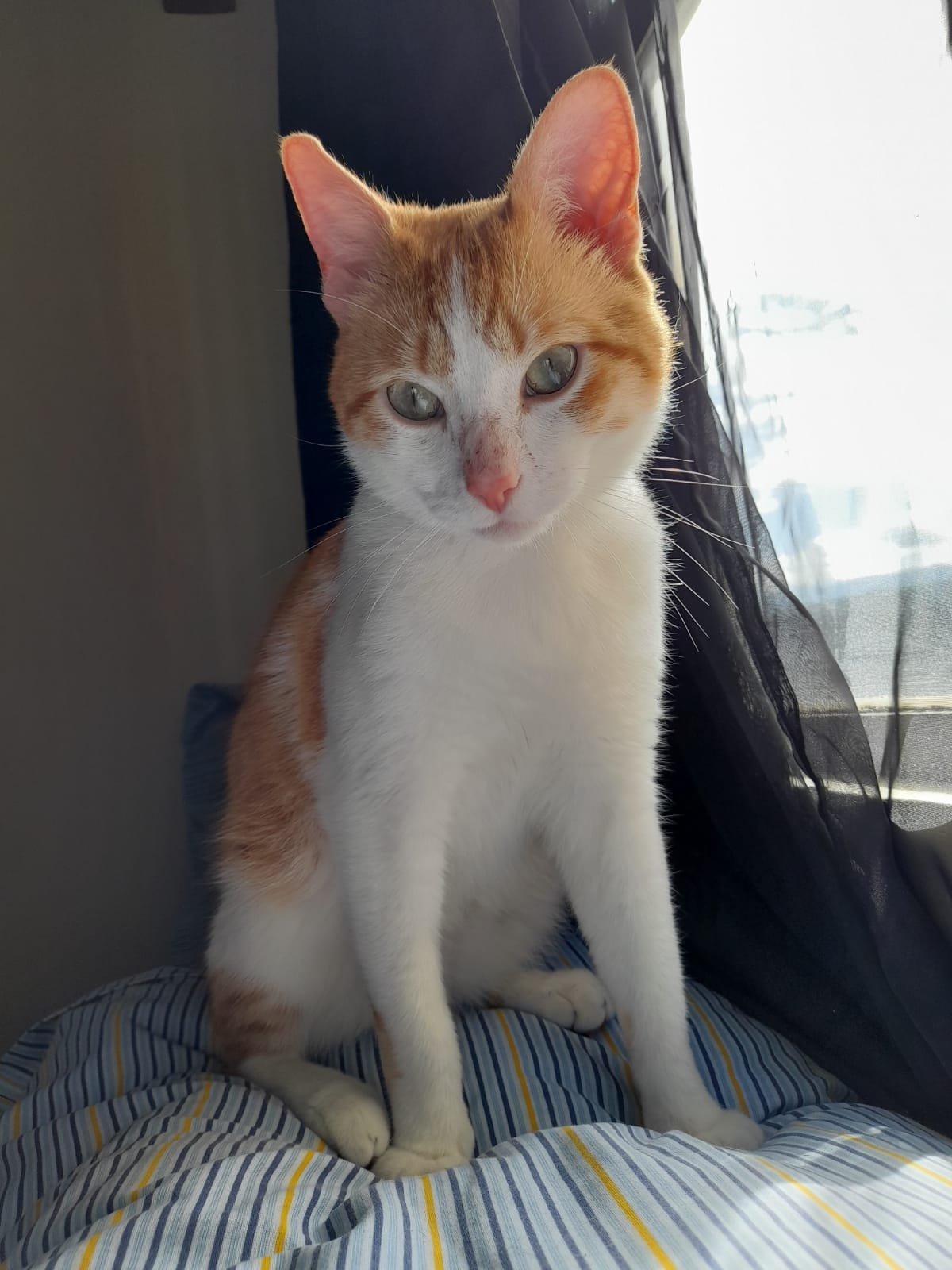 ✅ Es un gatito muy nervioso y desconfiado, es blanco con naranja, tiene aruñada la nariz, al final de su cola al tacto se siente un huesito torcido.