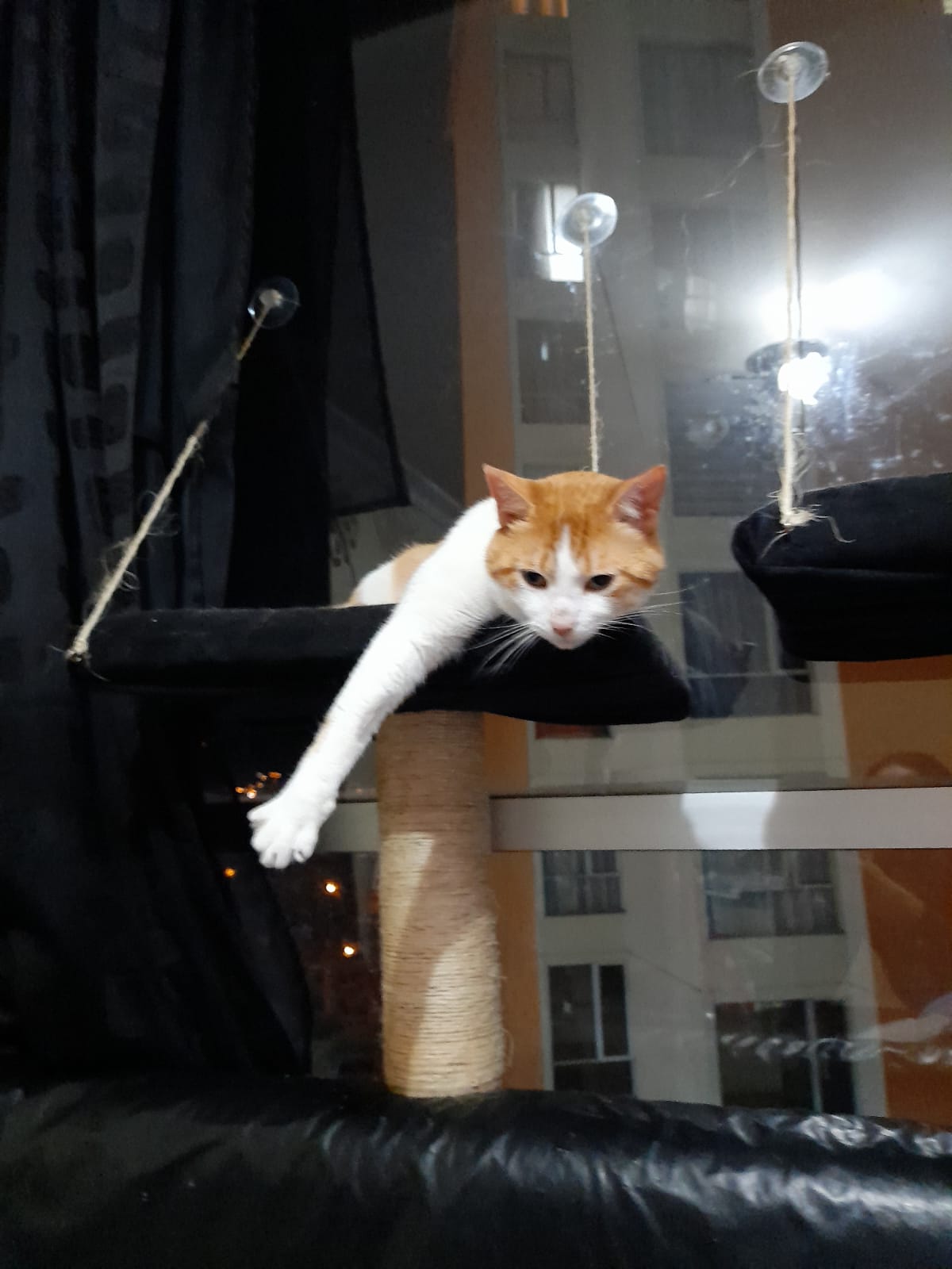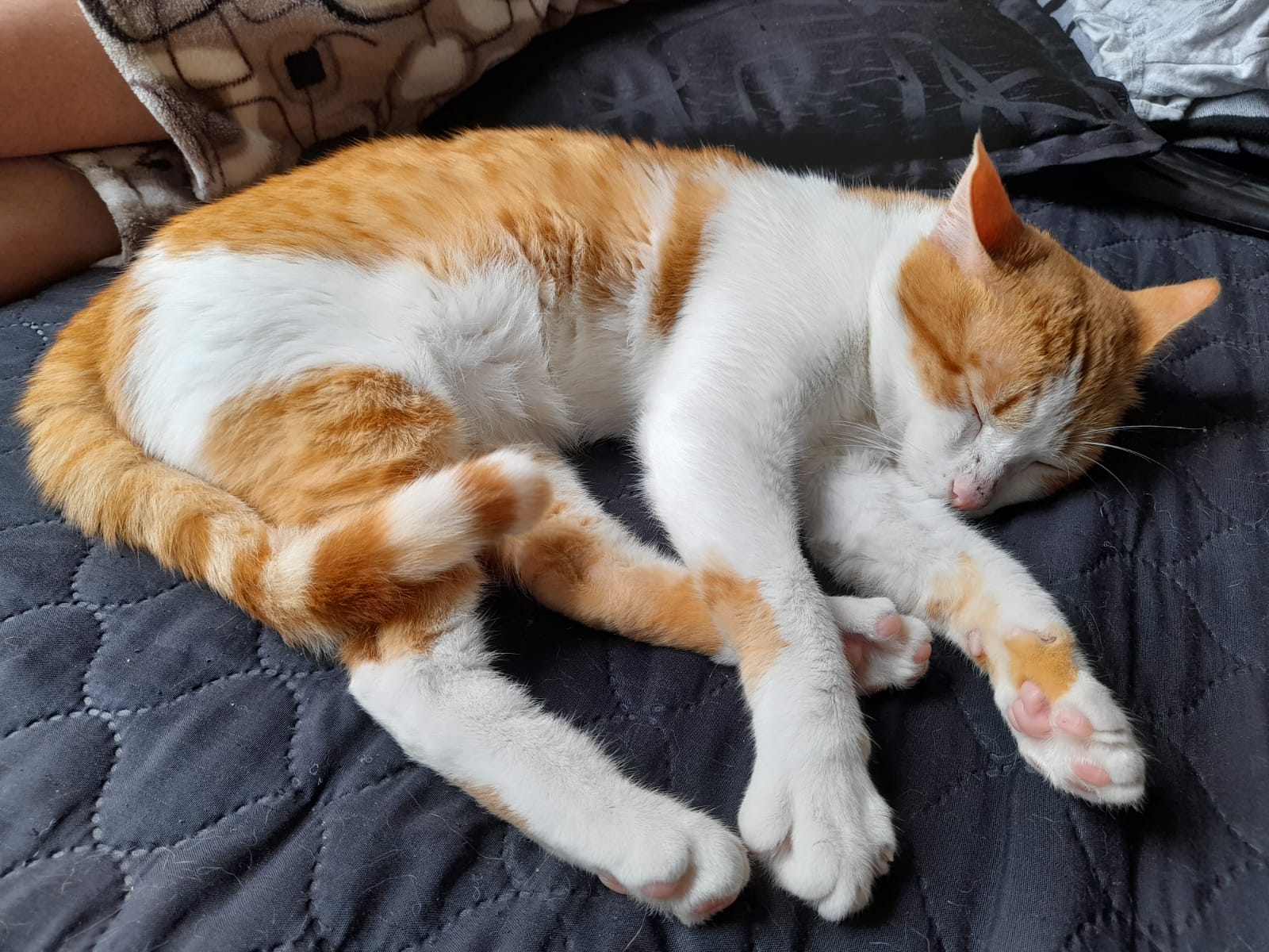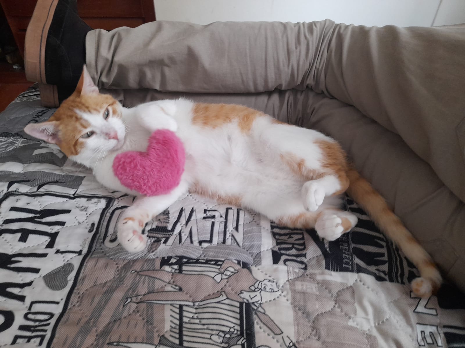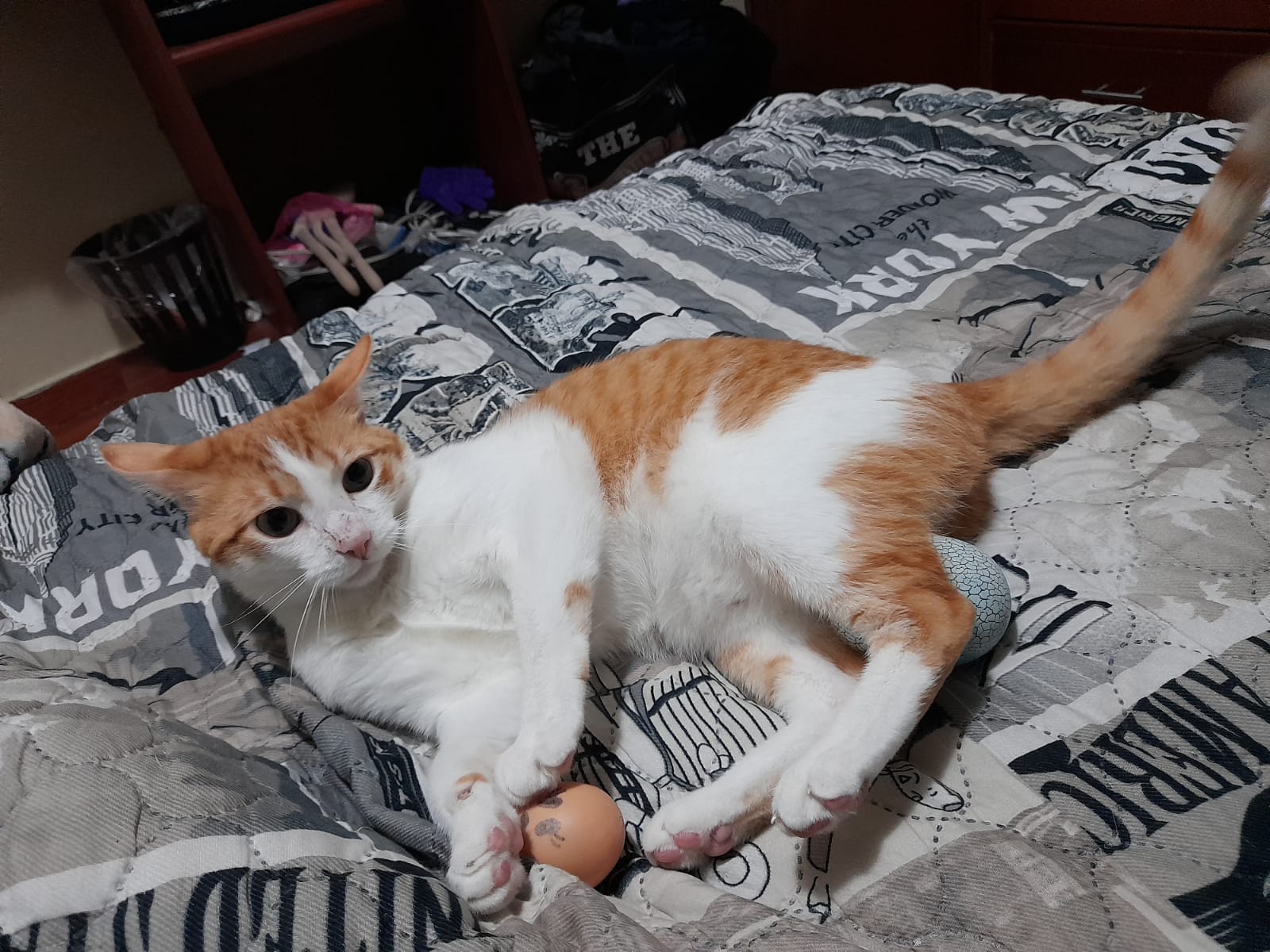 ✅ Es un gatito muy nervioso y desconfiado, es blanco con naranja, tiene aruñada la nariz, al final de su cola al tacto se siente un huesito torcido.