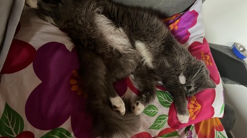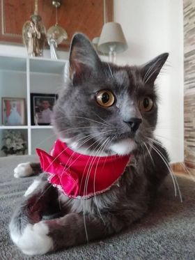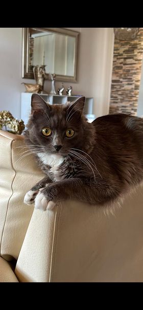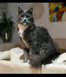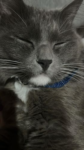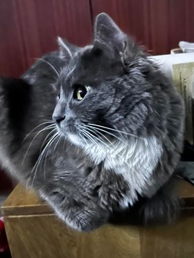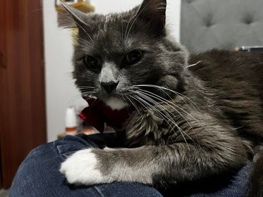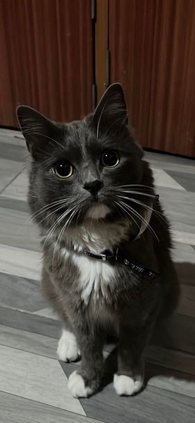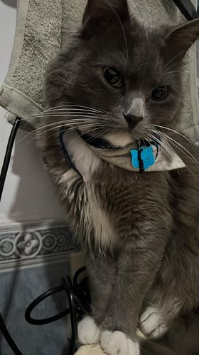 ✅ Merlín es gris, tiene su pecho, mentón, estómago y sus cuatro patas blancas, tiene bigotes blancos largos y ojos redondos y verdes, es de tamaño mediano tirando a pequeño, su cola es muy peluda como esponjada y larga al igual que su cuerpo es peludo pero el cuerpo no es esponjado solo peludo y liso, el no es gordo es más bien contextura media, su nariz es gris.