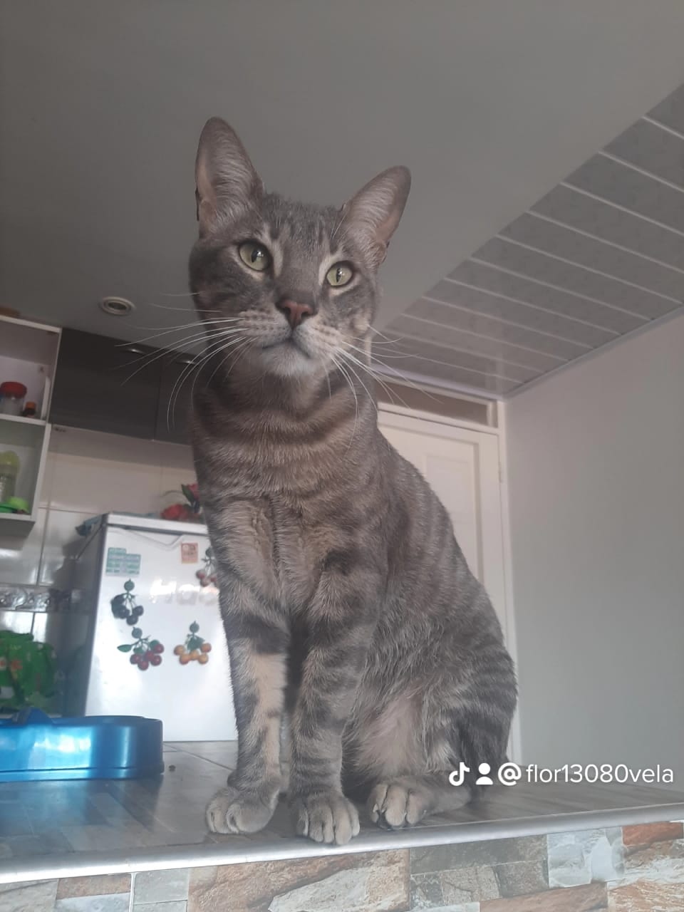 ✅ Es color cenizo con rallitas en las patas y manchas en la barriga.