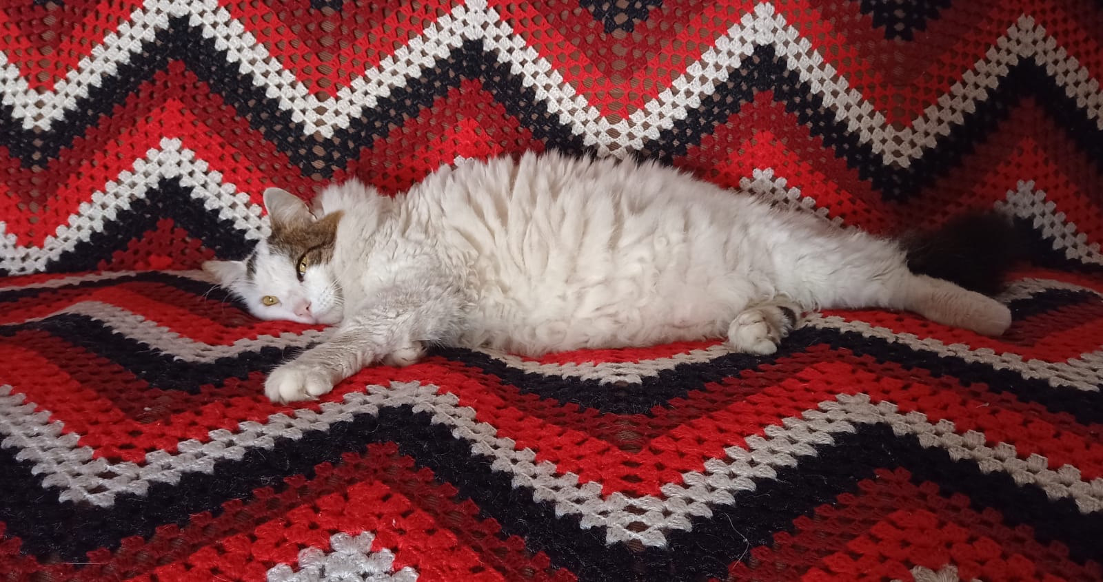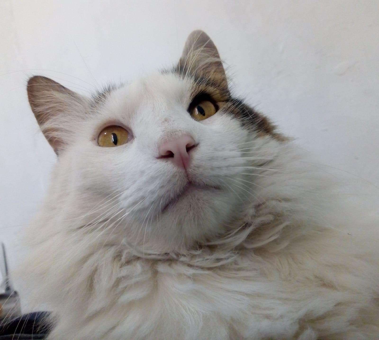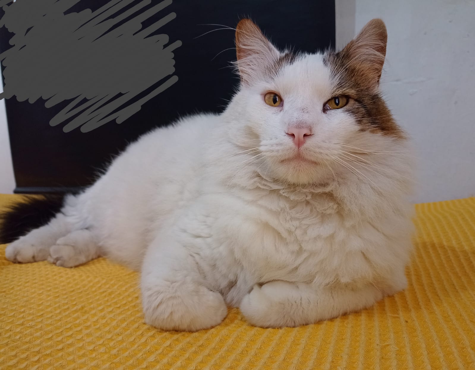 ✅ es muy gordo, pesa 9 kilos, es blanco con cola negra, muy peludo, las orejitas en la punta son cafés, y tiene una mancha café a un lado de la cabeza.