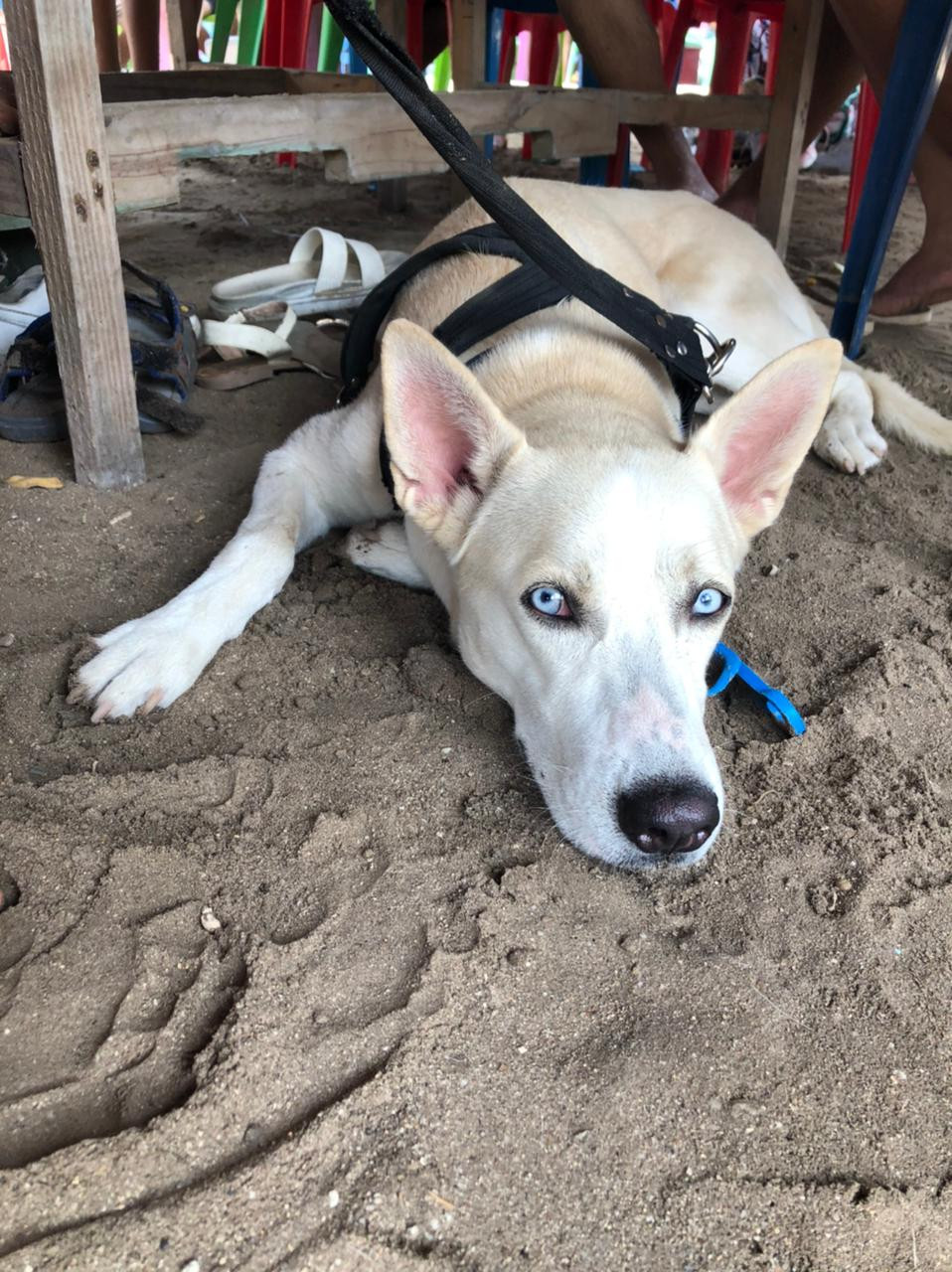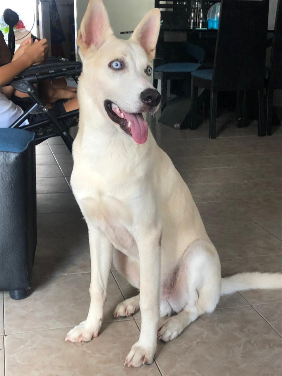 ✅ Perro lobo de poco pelo, color blanco/ rubio, ojos azules, estatura mediana.