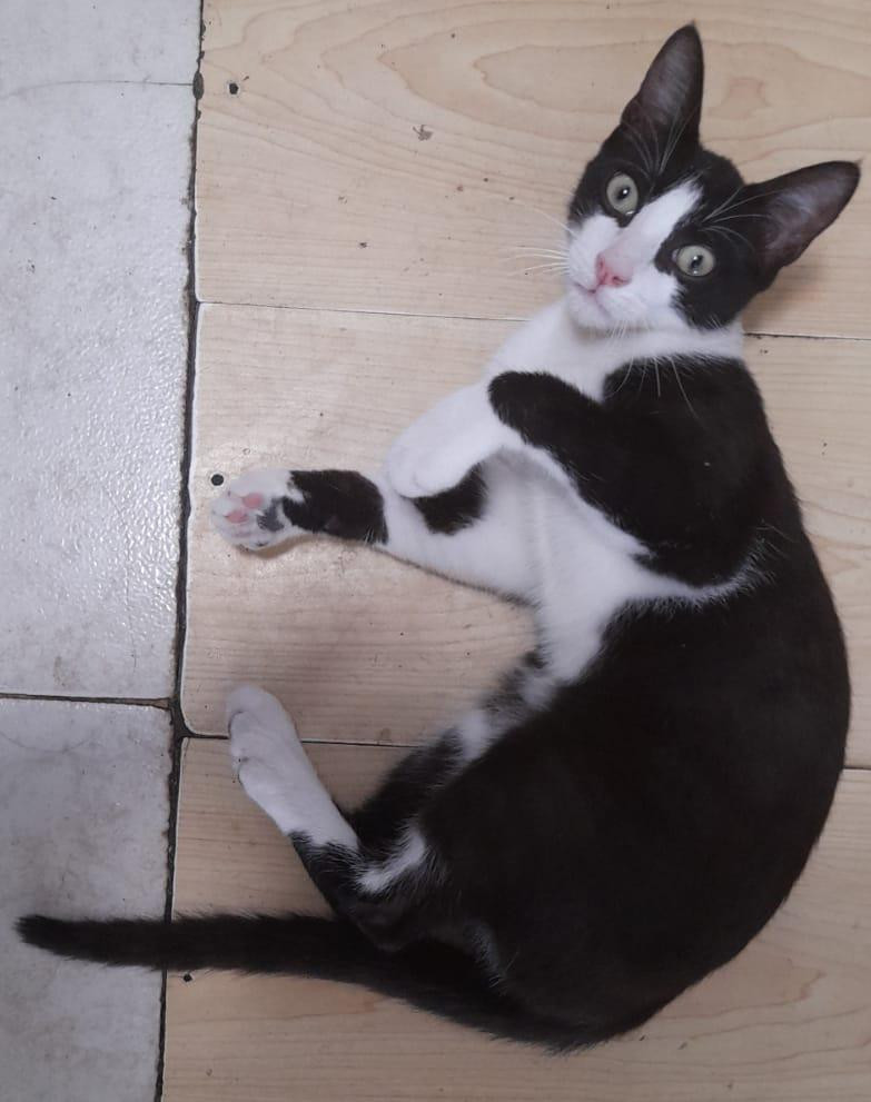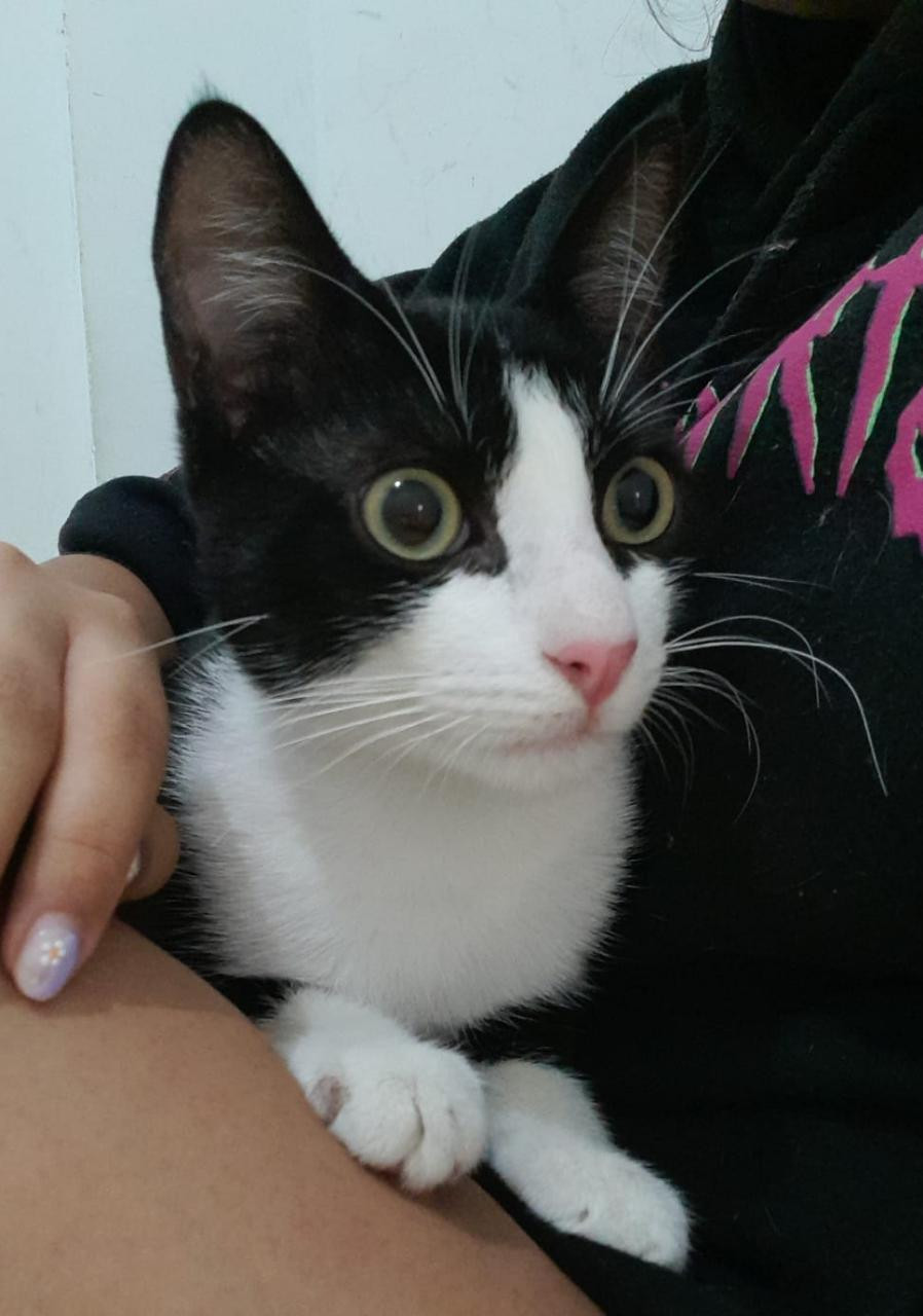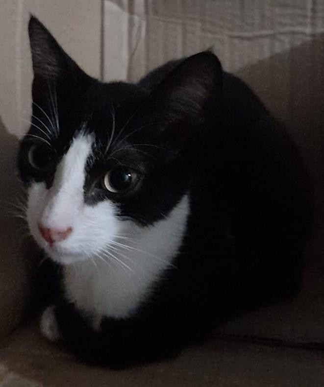 ✅ Es un gatico de color negro con blanco (predomina el negro), la nariz es muy rosadita, sus ojos son verdes y las paticas blancas como si tuviera boticas.