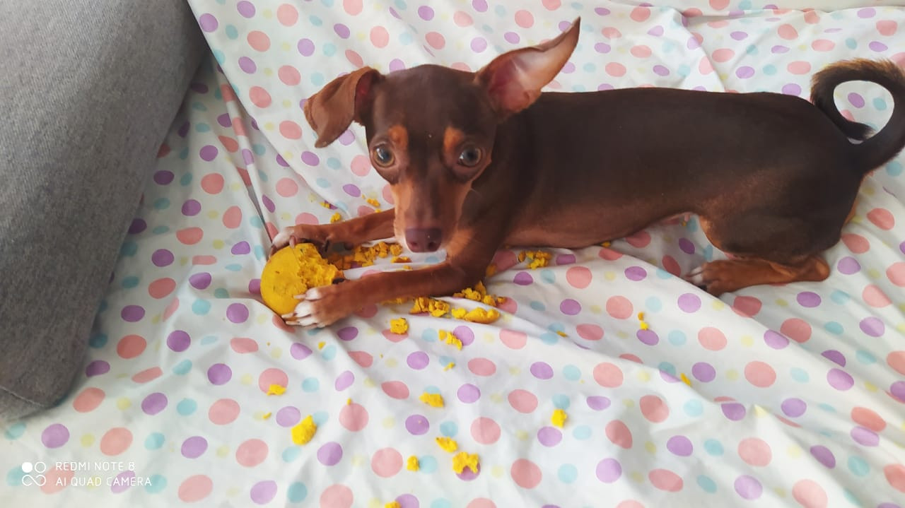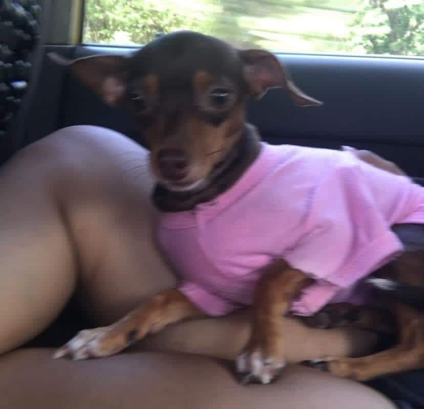 ✅ Es una perrita pincher, es de color café, su colita en la punta y patas de color blanco, tiene los ojos claros.