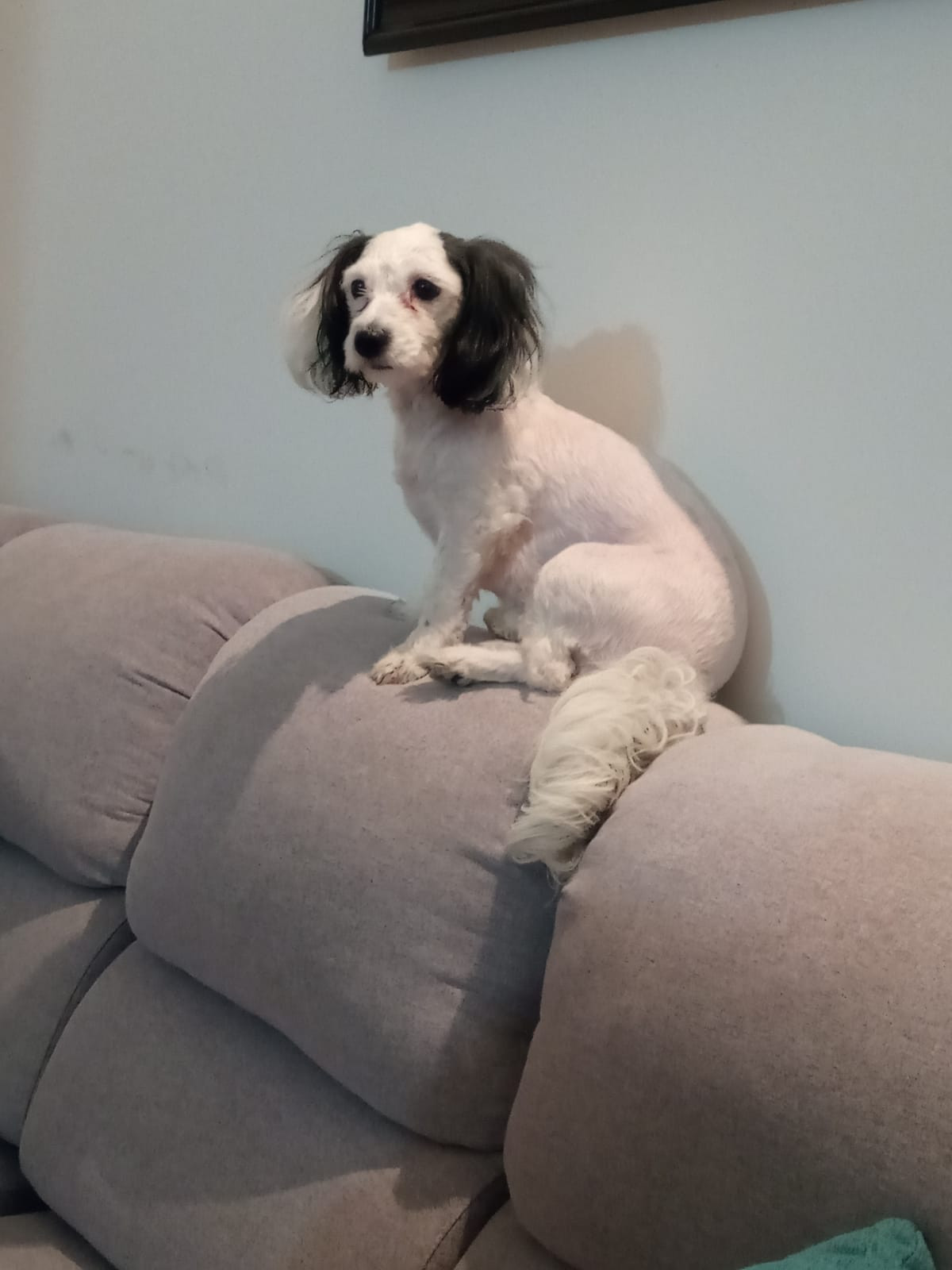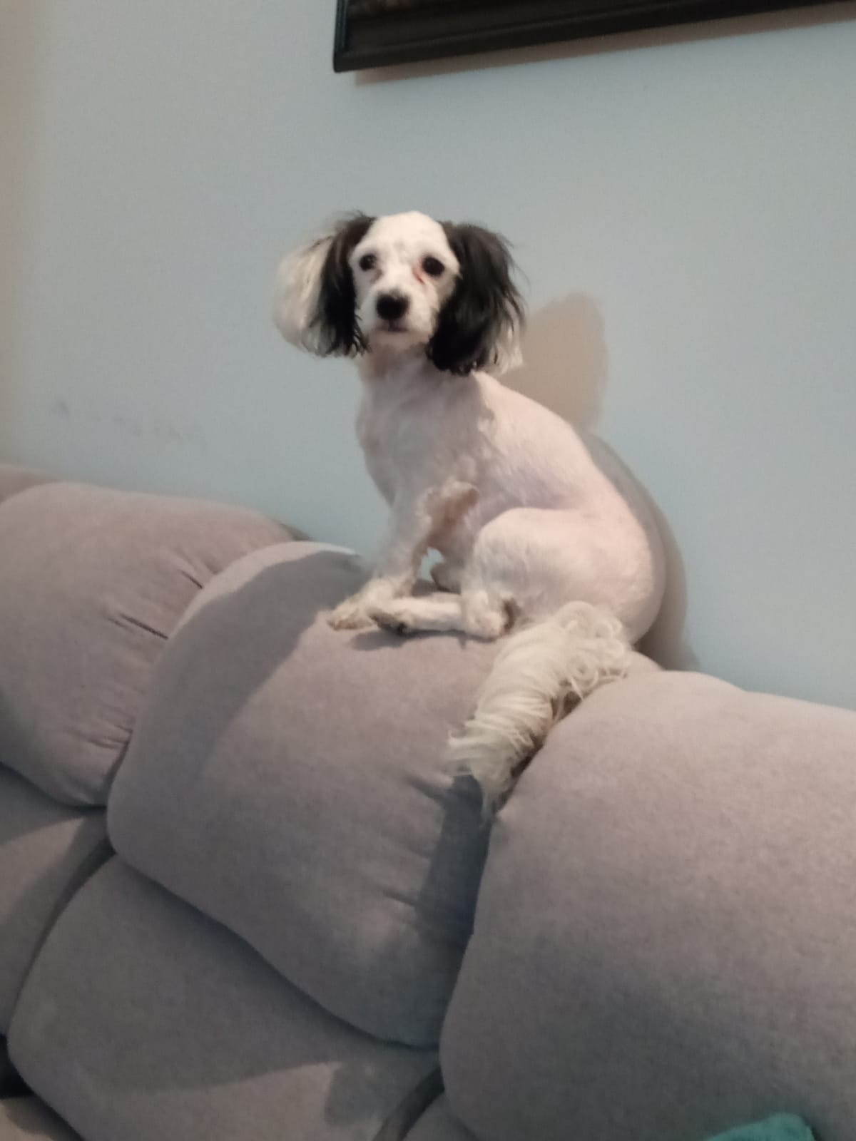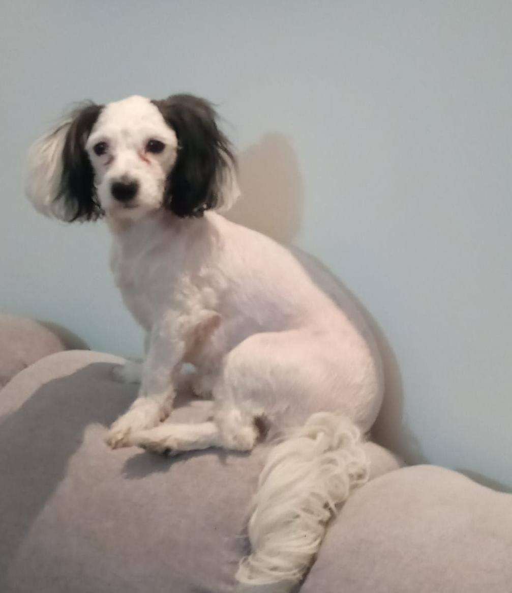 ✅ Es una perrita blanca de orejas negras y su cola es paradita y peluda, estaba recién peluqueada en el momento en el que se perdió.