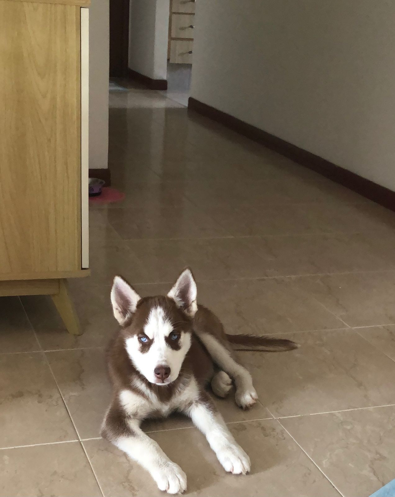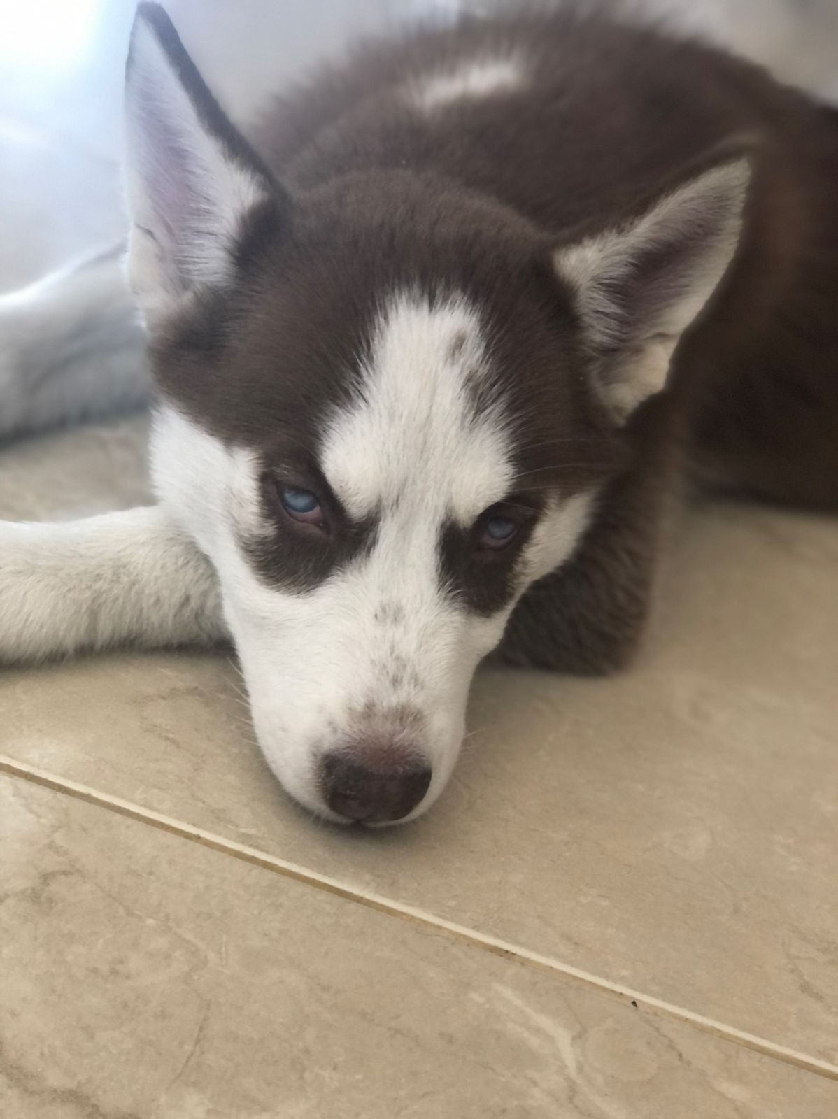 ✅ Es una perrita, de color café claro, su carita es blanca y sus ojitos azules .
