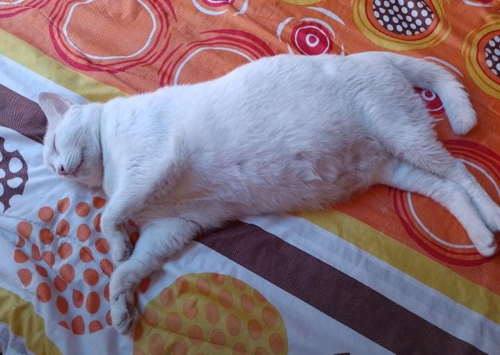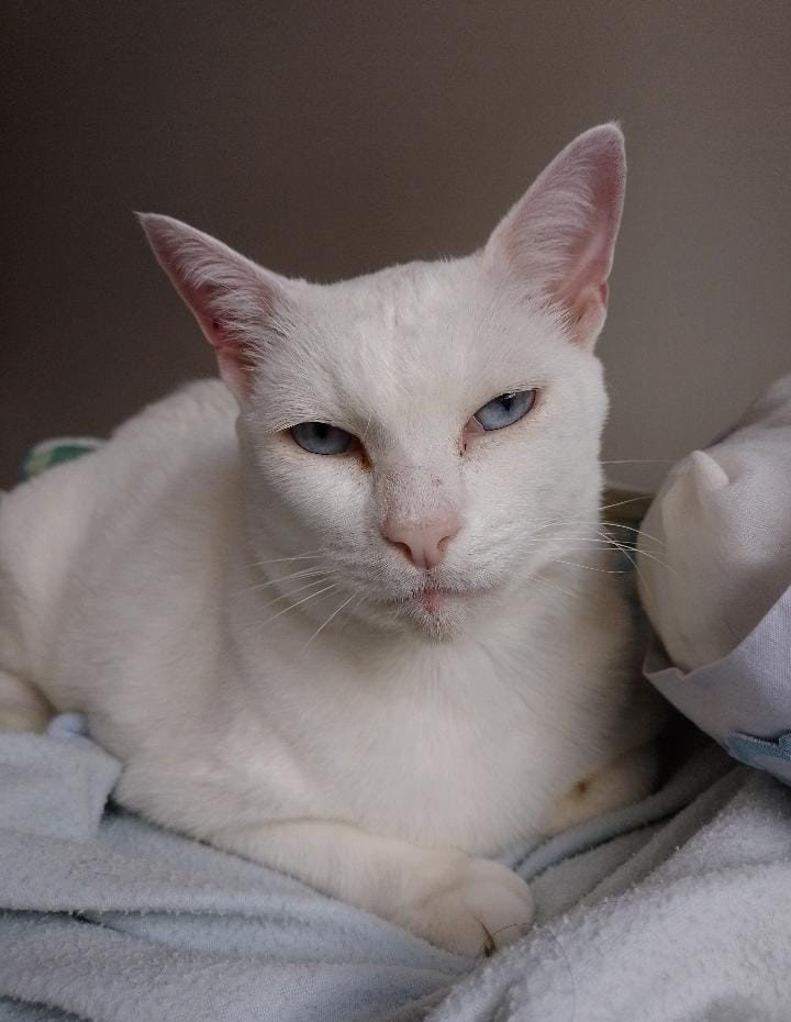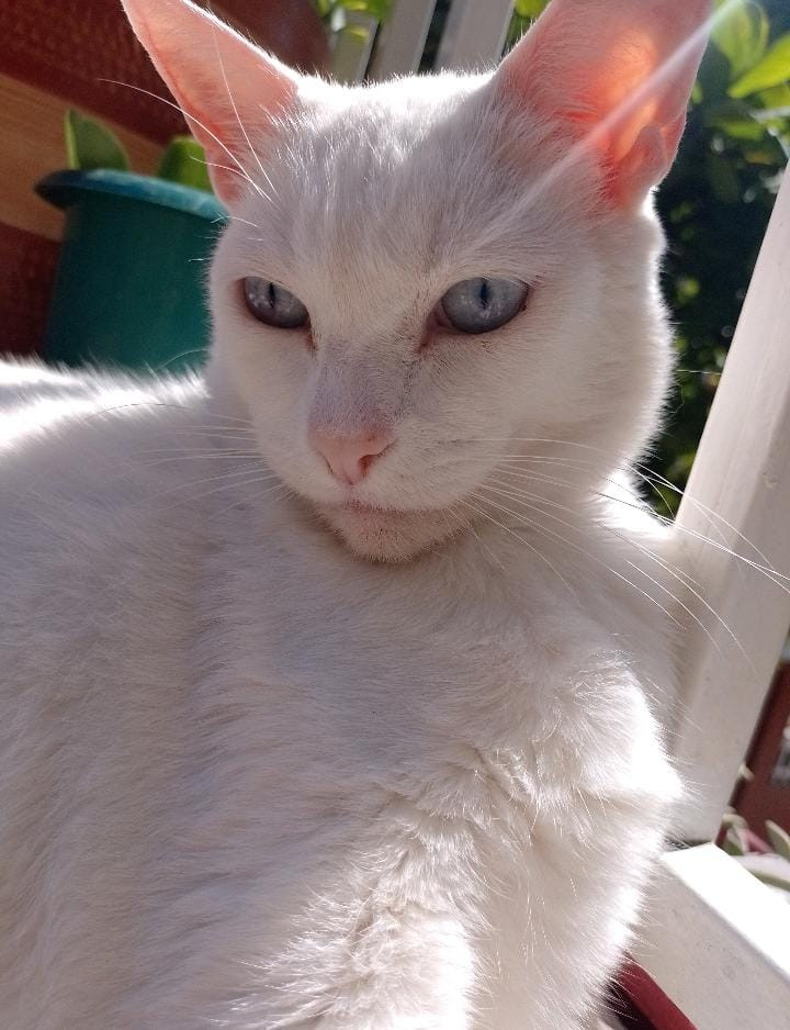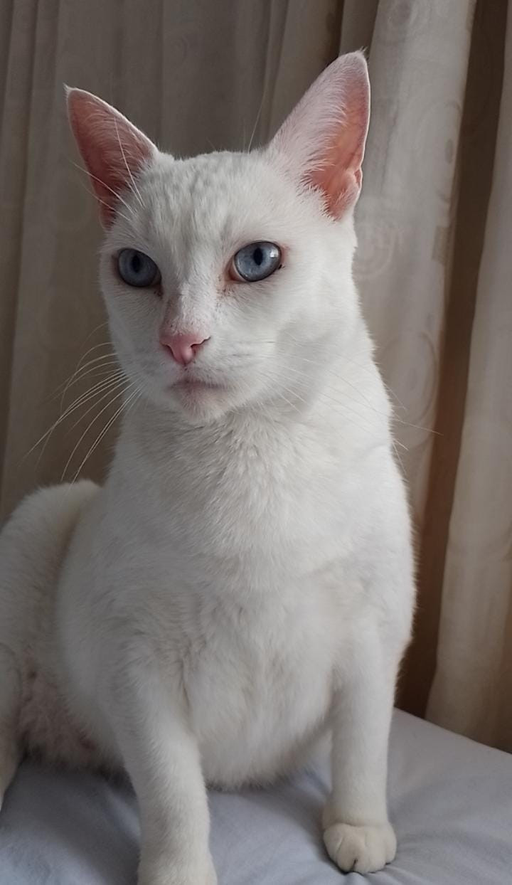 ✅ El gato tiene cola corta, es blanco de ojos azules, es gordito y es sordo.