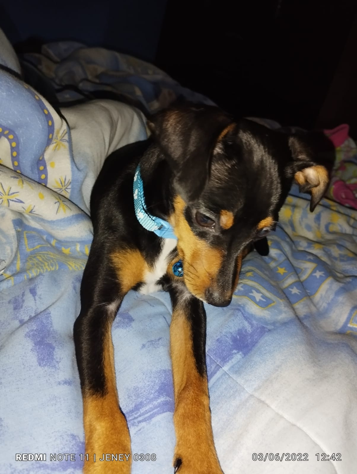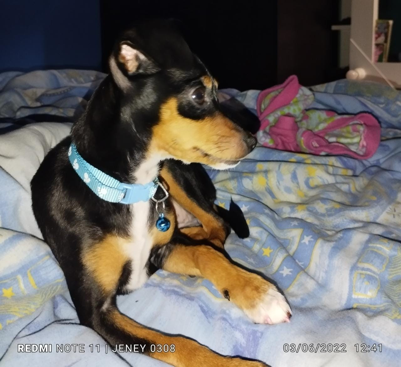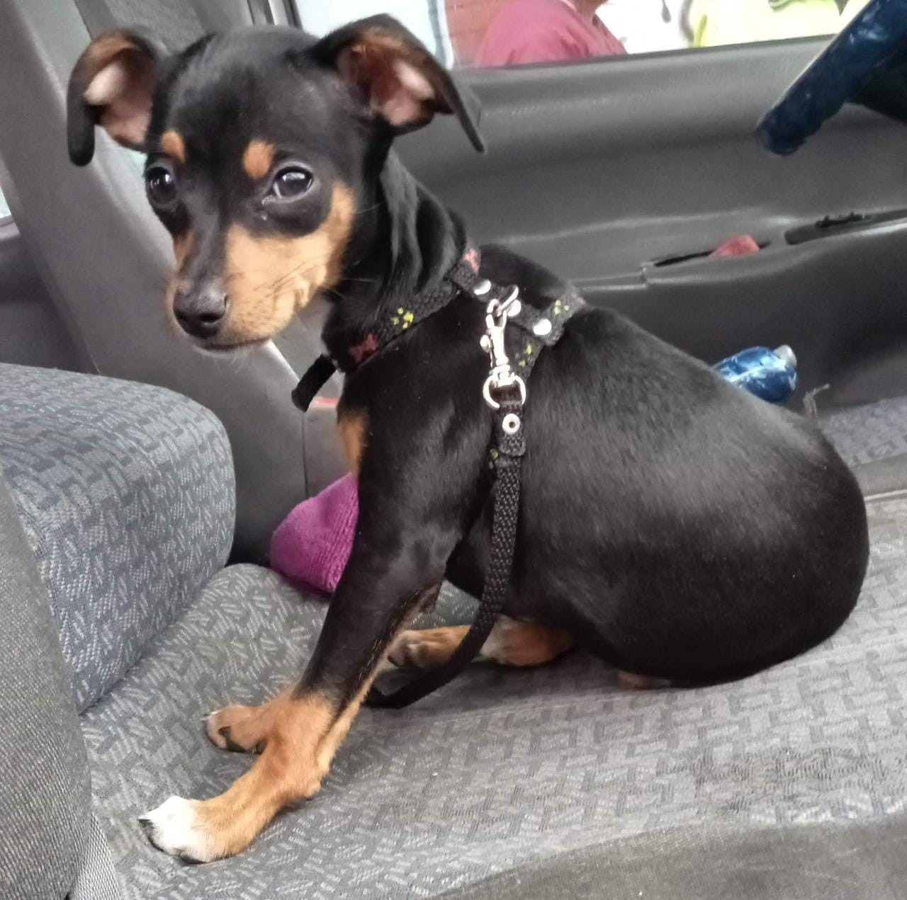 ✅ Cuando se perdió tenía puesto un collar azul con patitas blancas y un arnés negro con fucsia.