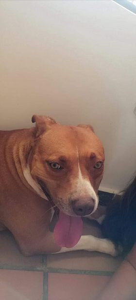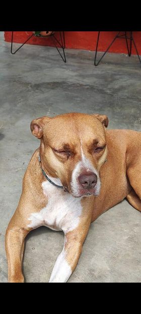 ✅ Es una perrita de raza pitbul, de tamaño grande, el color del pelaje es café con una mancha blanca en el pecho y las paticas y sus ojos son claros.