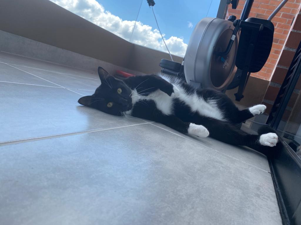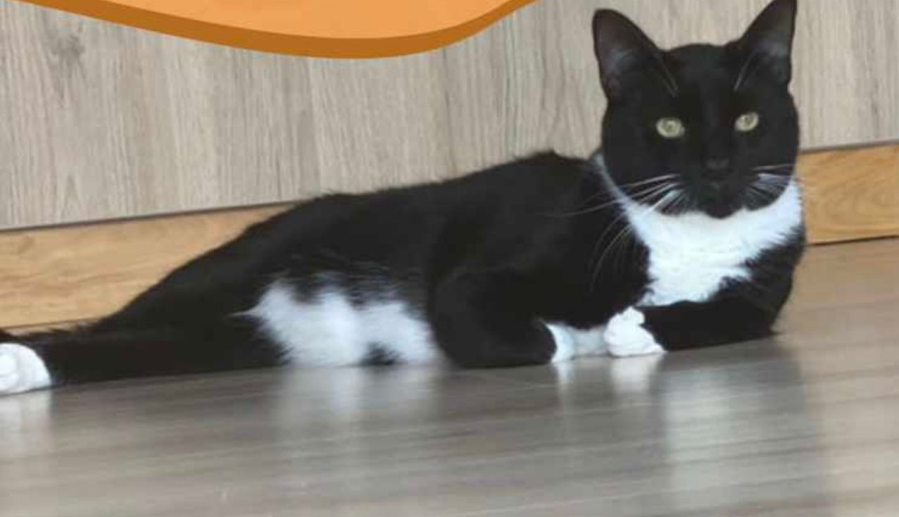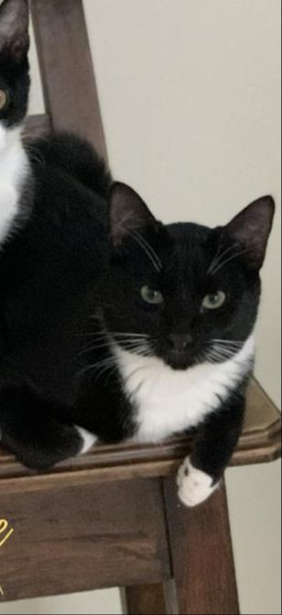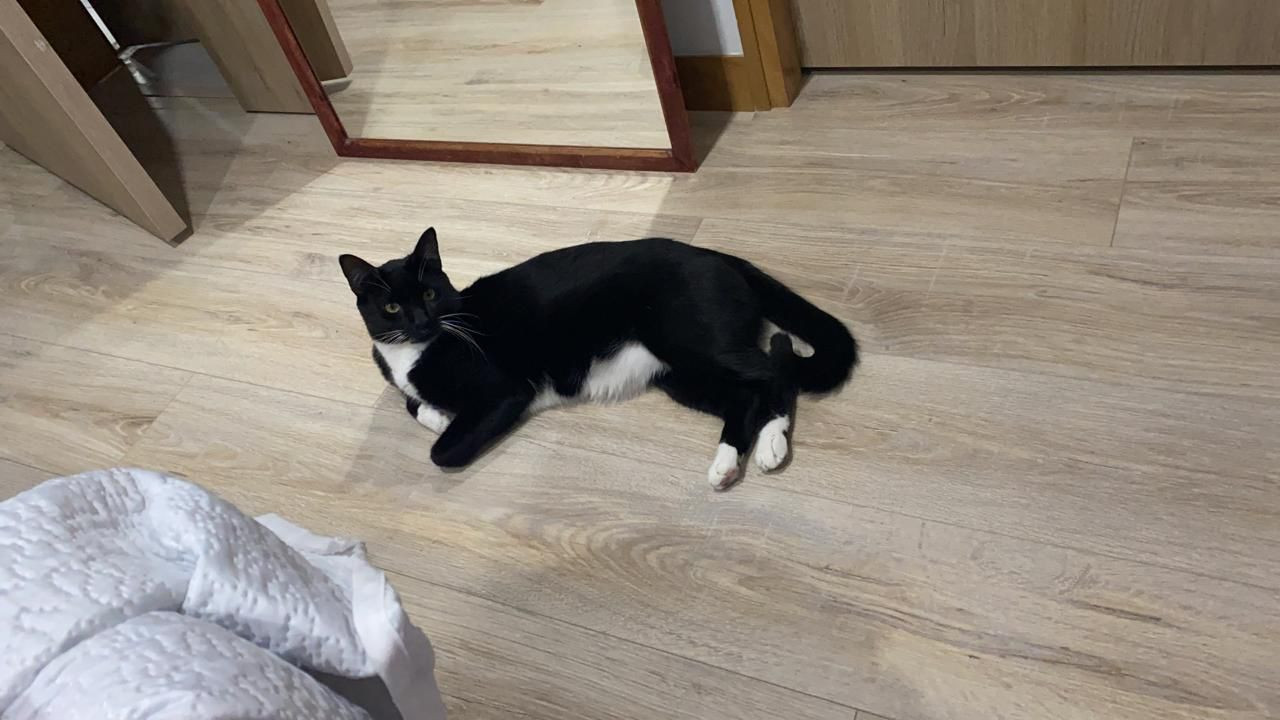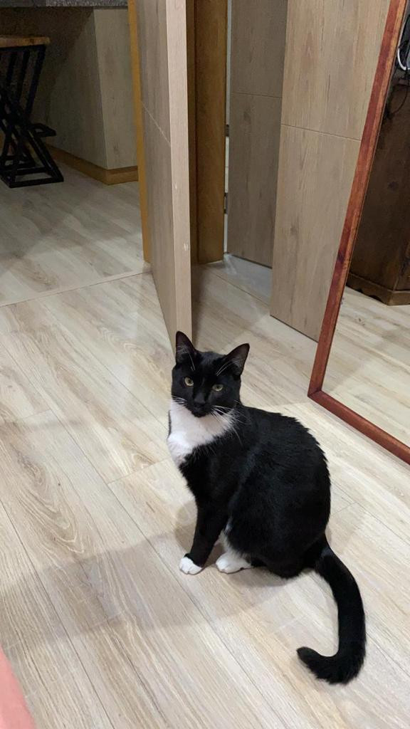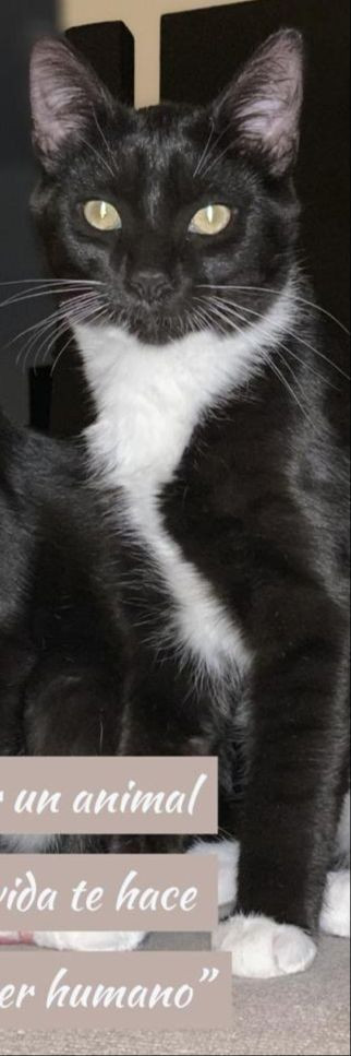 ✅ Es un gatico, macho, criollito, de color negro y tiene blanco en el pecho, parte de su barriguita y en sus paticas, tiene 1 año de edad, esta esterilizado.