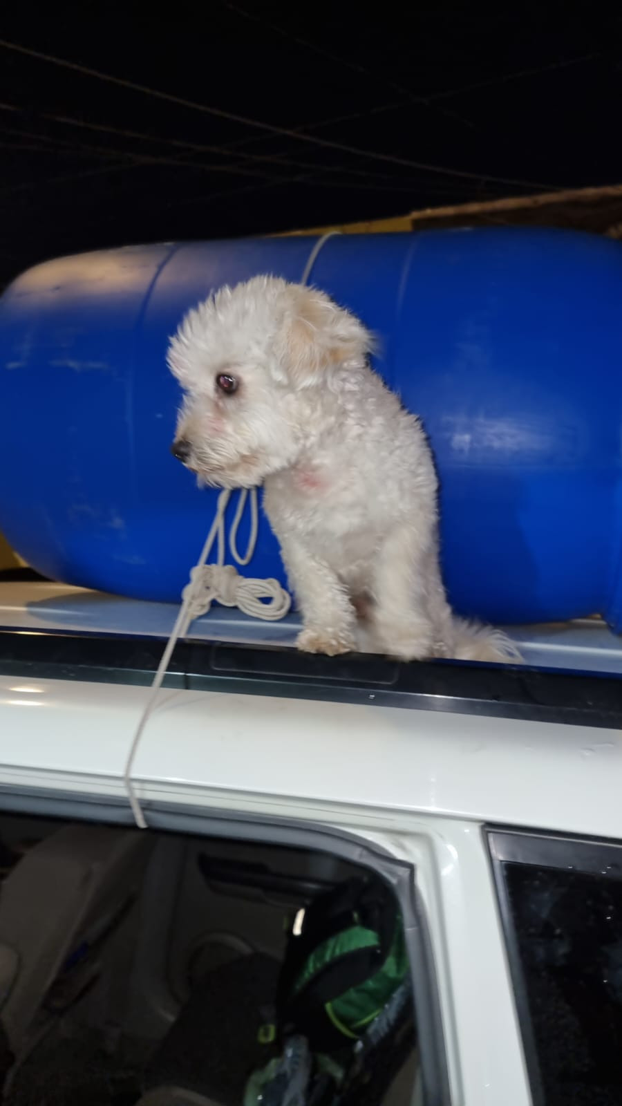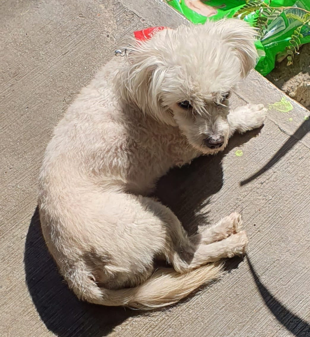 ✅ Es un perrito, macho, de raza Maltés; es de color blanco, con poco pelo , es de color beige en el lomo, mide de 20 A 25 Cm de altura aproximadamente.