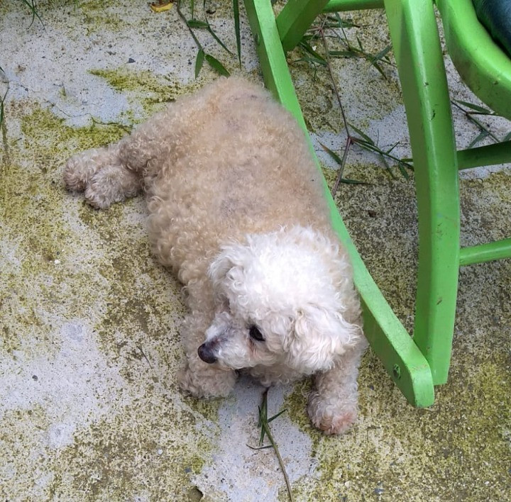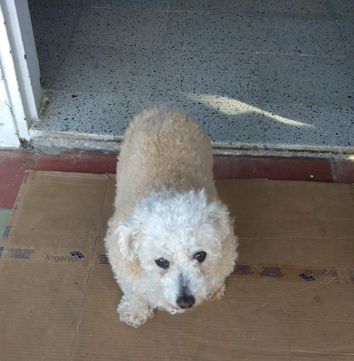 ✅ Es una perrita adulta, cruzada de maltés con poodle, su color es entre blanco perla y beige, es coja de una patita, sus orejas son cortas, tiene un problema en las patitas, sus uñas son muy largas, y se rasca mucho, tiene las orejas cortas y pequeñas, no tiene cola, es muy nerviosa. Necesita medicamentos para la tiroides, entre otros.