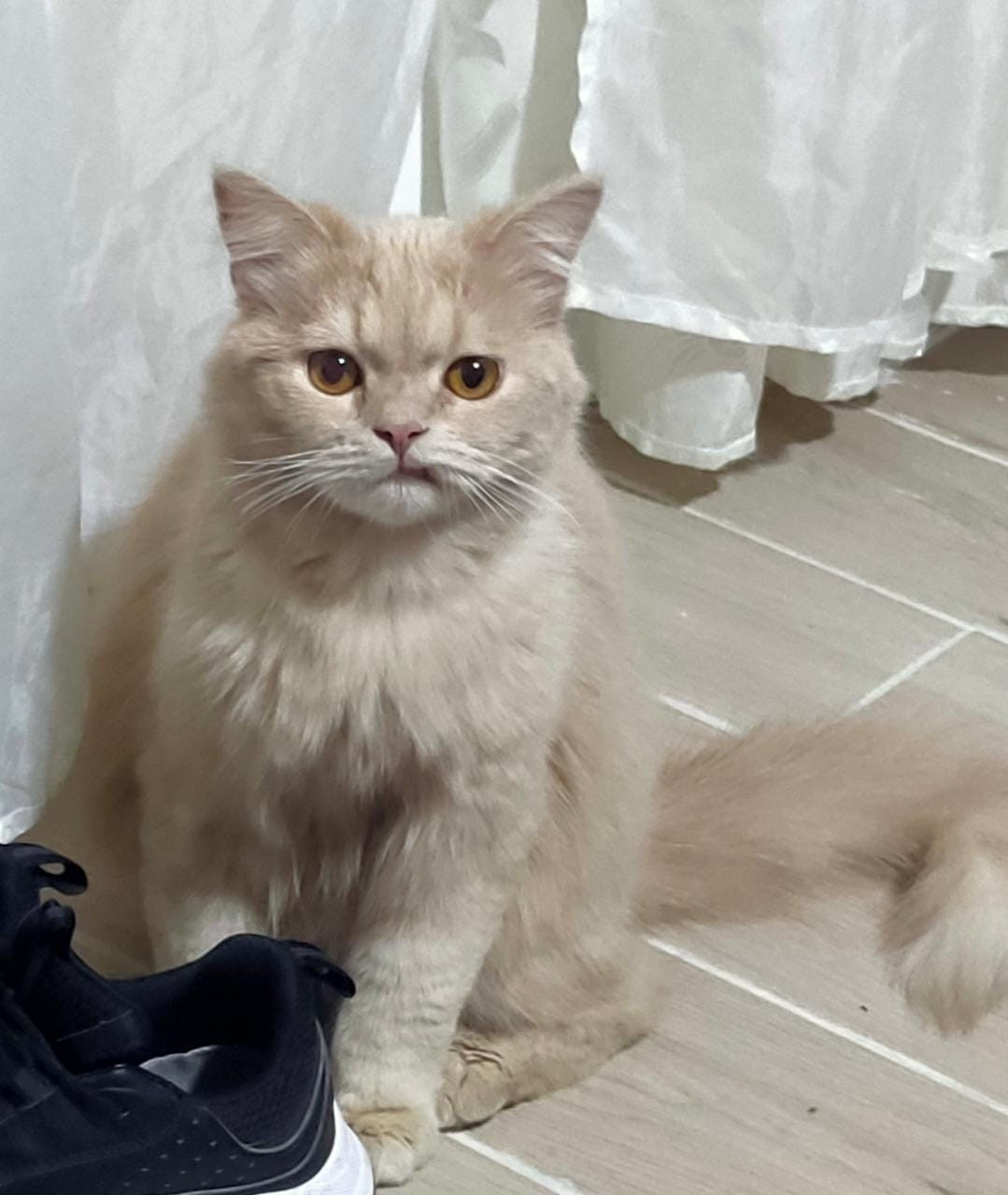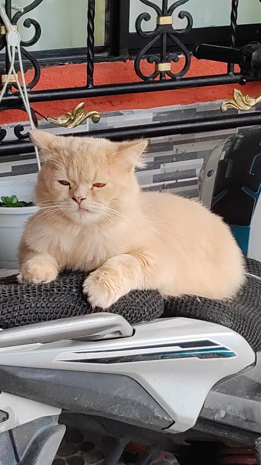✅ Es un gatico, macho, de raza Persa Himalaya, es esquivo, de color amarillito canela, sus ojitos son de color miel y es peludo.