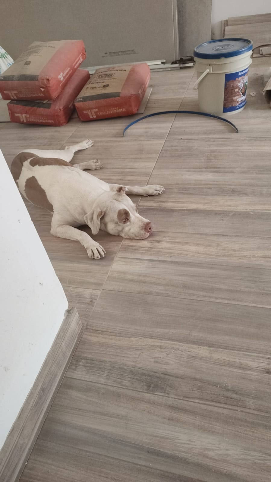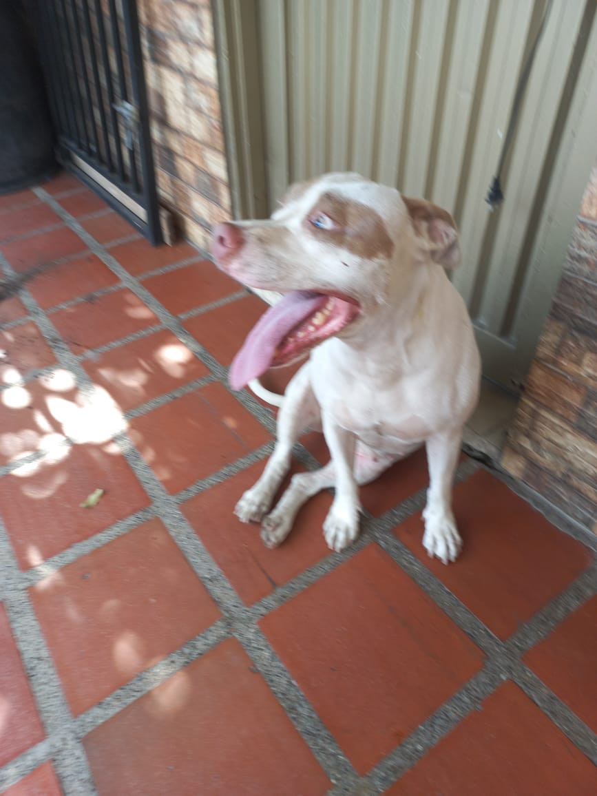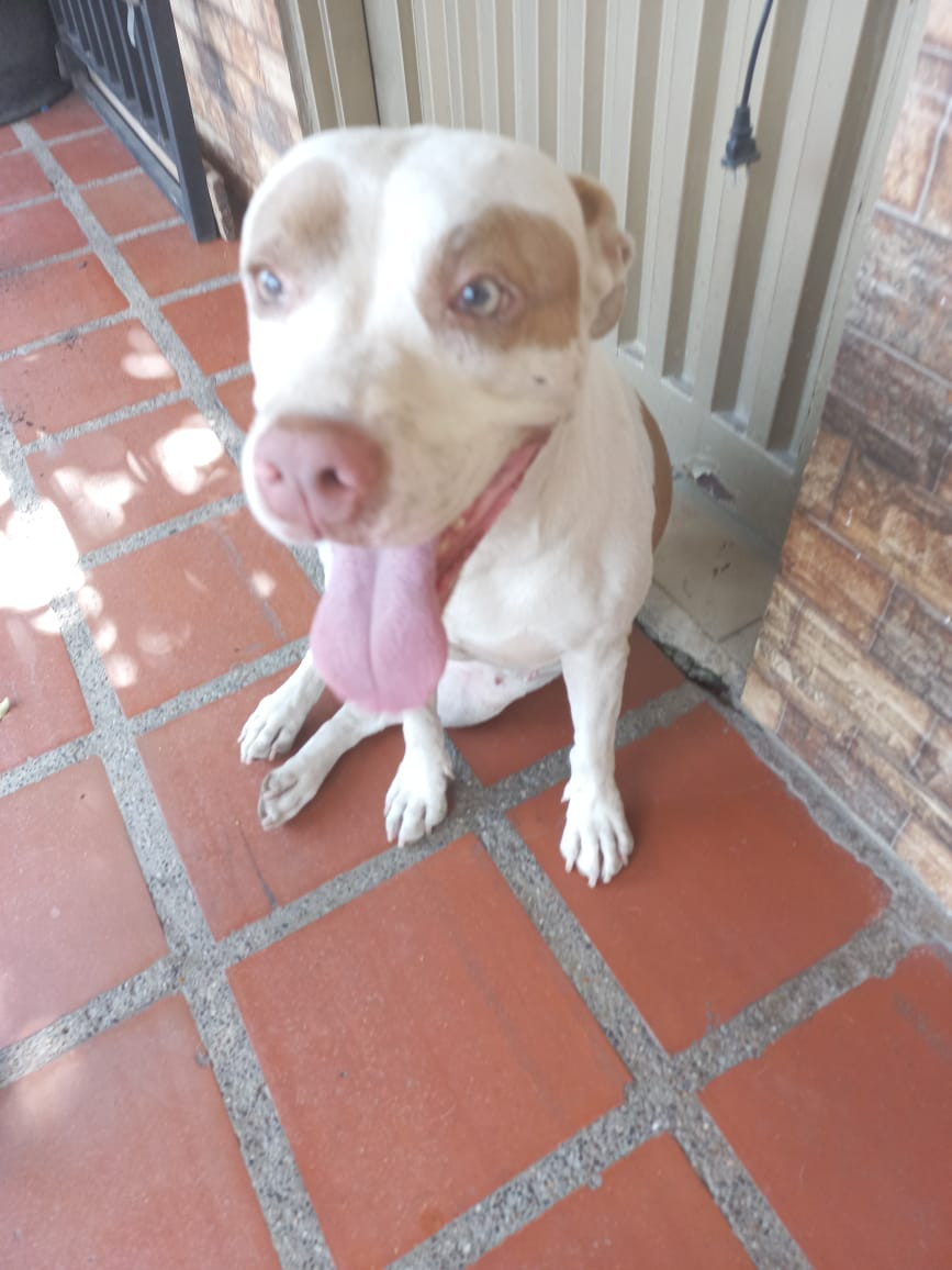 ✅ Es una perrita de raza pitbull, es blanca con manchas cafés, tiene manchas en los ojos como si fueran gafas cafés y una mancha en la cintura forma corazón, es gordita.