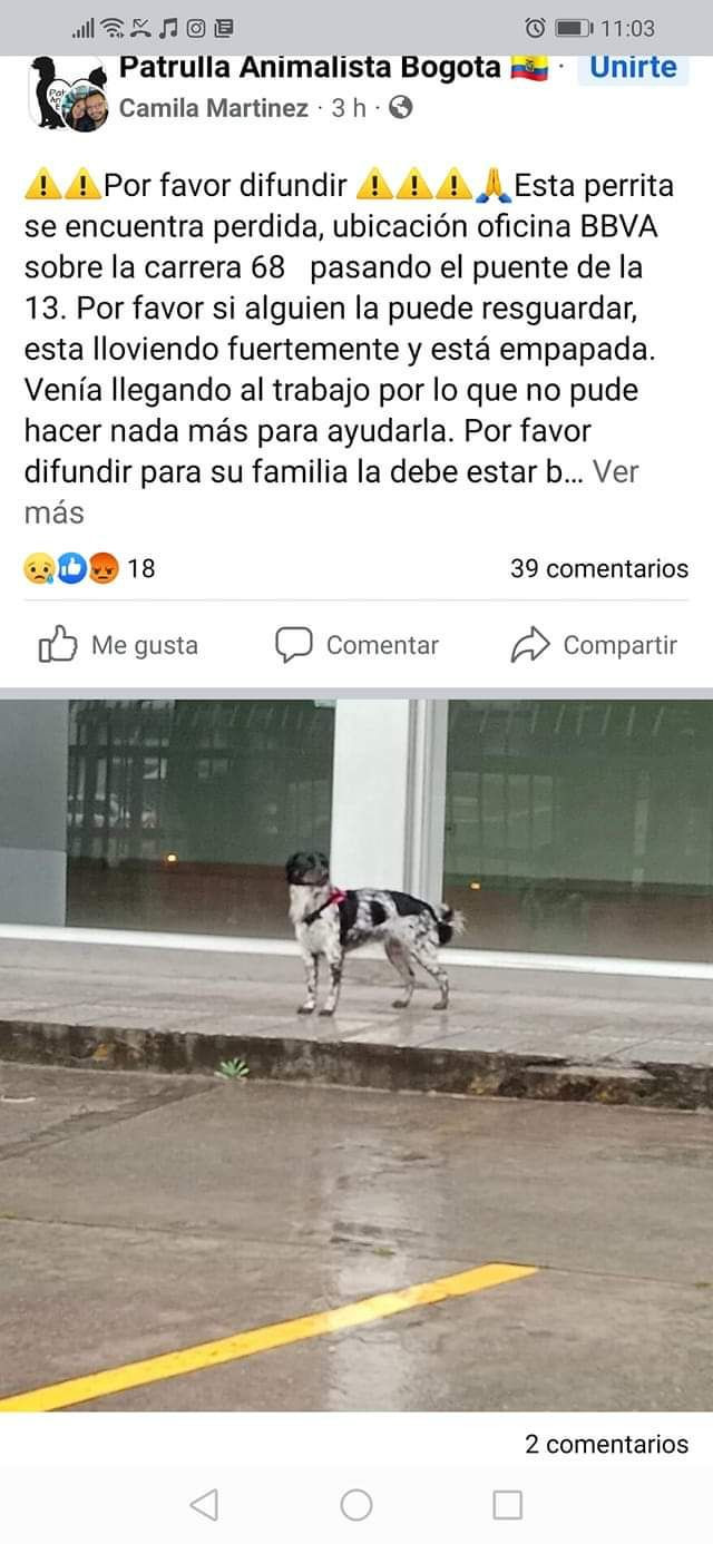Si la ves, puedes darle hogar de paso 🏡 mientras su familia la recoge🙏 También puedes escribirnos 📩 al Messenger de Petzy, por DM o a nuestra línea ☎️ Whatsapp 313 349 7682.
